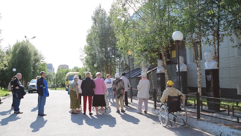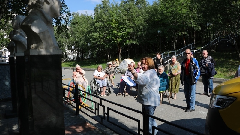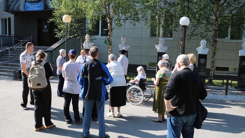 Бюсты 9 любимых заполярных поэтов и писателей установлены перед зданием библиотеки. Это Николай Рубцов, Владимир Смирнов, Валентин Пикуль, Виталий Маслов, Александр Подстаницкий, Николай Скромный, Виктор Тимофеев, Михаил Орешета, Николай Колычев. Экскурсанты узнали о вкладе этих замечательных людей в культурную и общественную жизнь Кольского края. В конце встречи гости получили в подарок книгу мурманской писательницы Ирины Ядринцевой «Мурманск – Арктики столица» и книжку Мурманского книжного издательства «Сальная свеча» Г-Х.Андерсена.