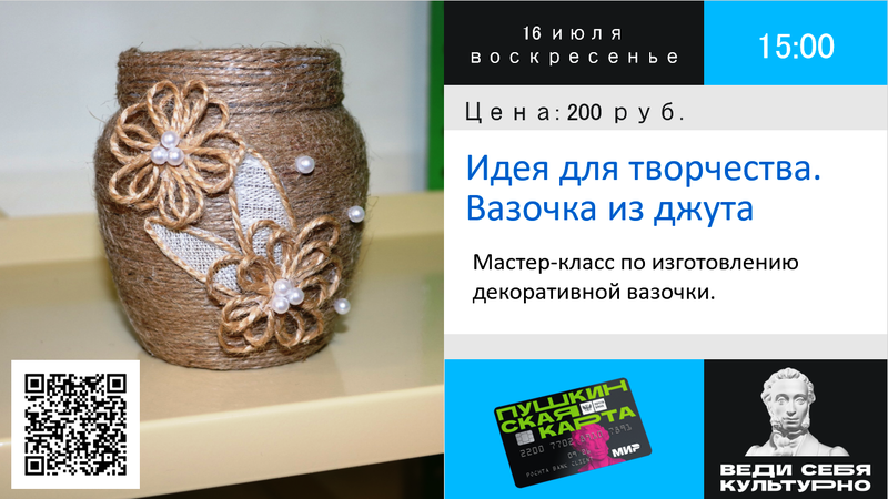16 июля в 15:00 отдел художественной литературы приглашает всех желающих на творческое занятие по изготовлению декоративной вазочки