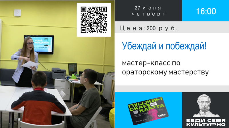 Красноречие и умение выступать перед большой аудиторией пригодится везде: при общении с другими людьми, в учебном процессе, на работе. На мастер-классе участники научатся бороться с волнением перед выходом на публику, подберут свою идеальную «позу оратора», а также познакомятся с секретами публичных выступлений известных спикеров.