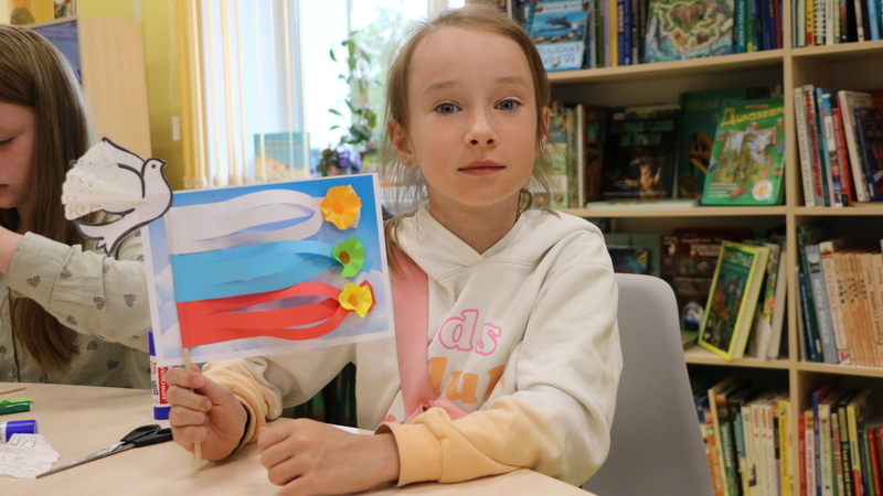 В заключение из цветной бумаги с помощью ножниц и клея участники сделали аппликацию «Флаг России». Украсили ее цветами и голубем мира.