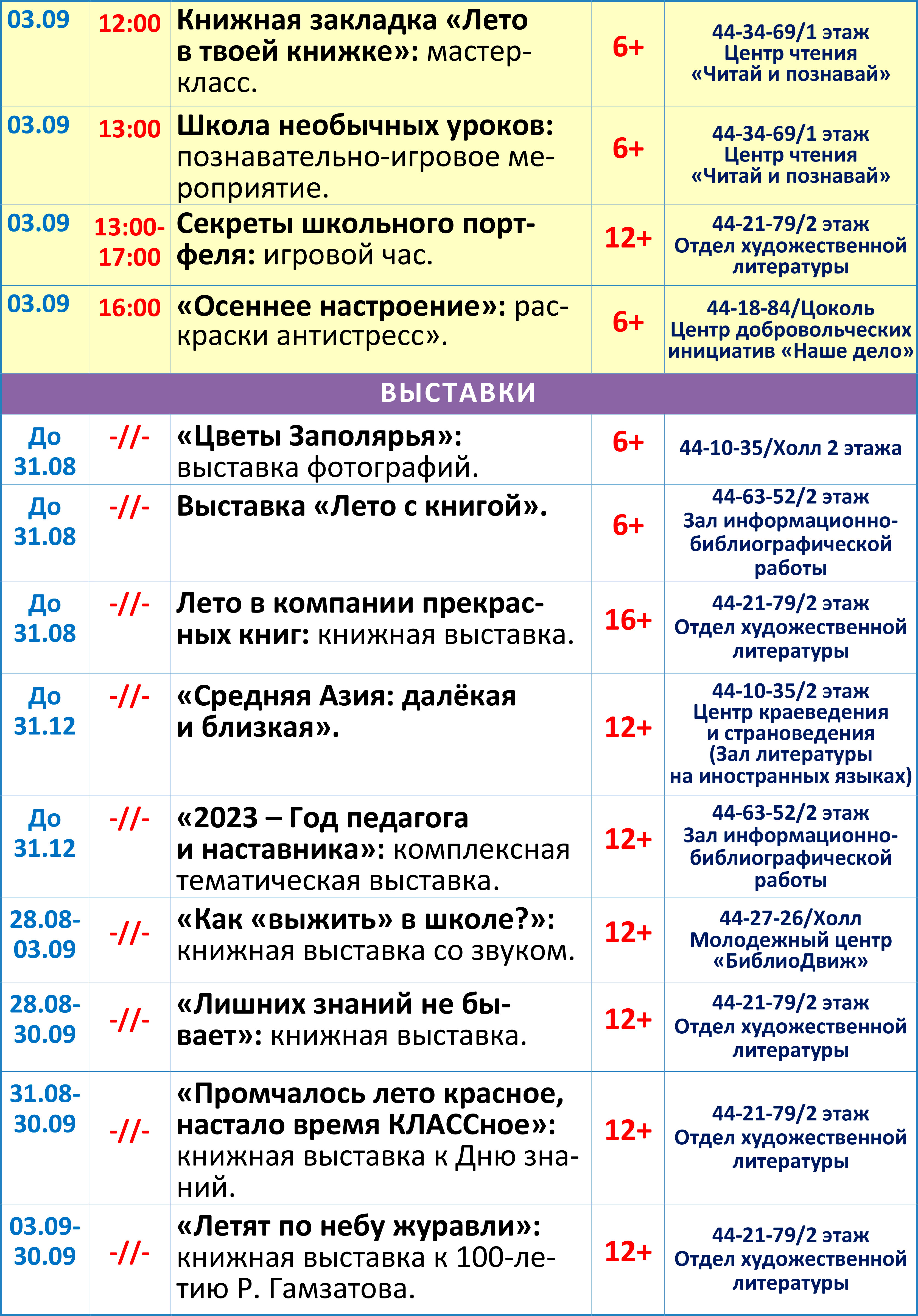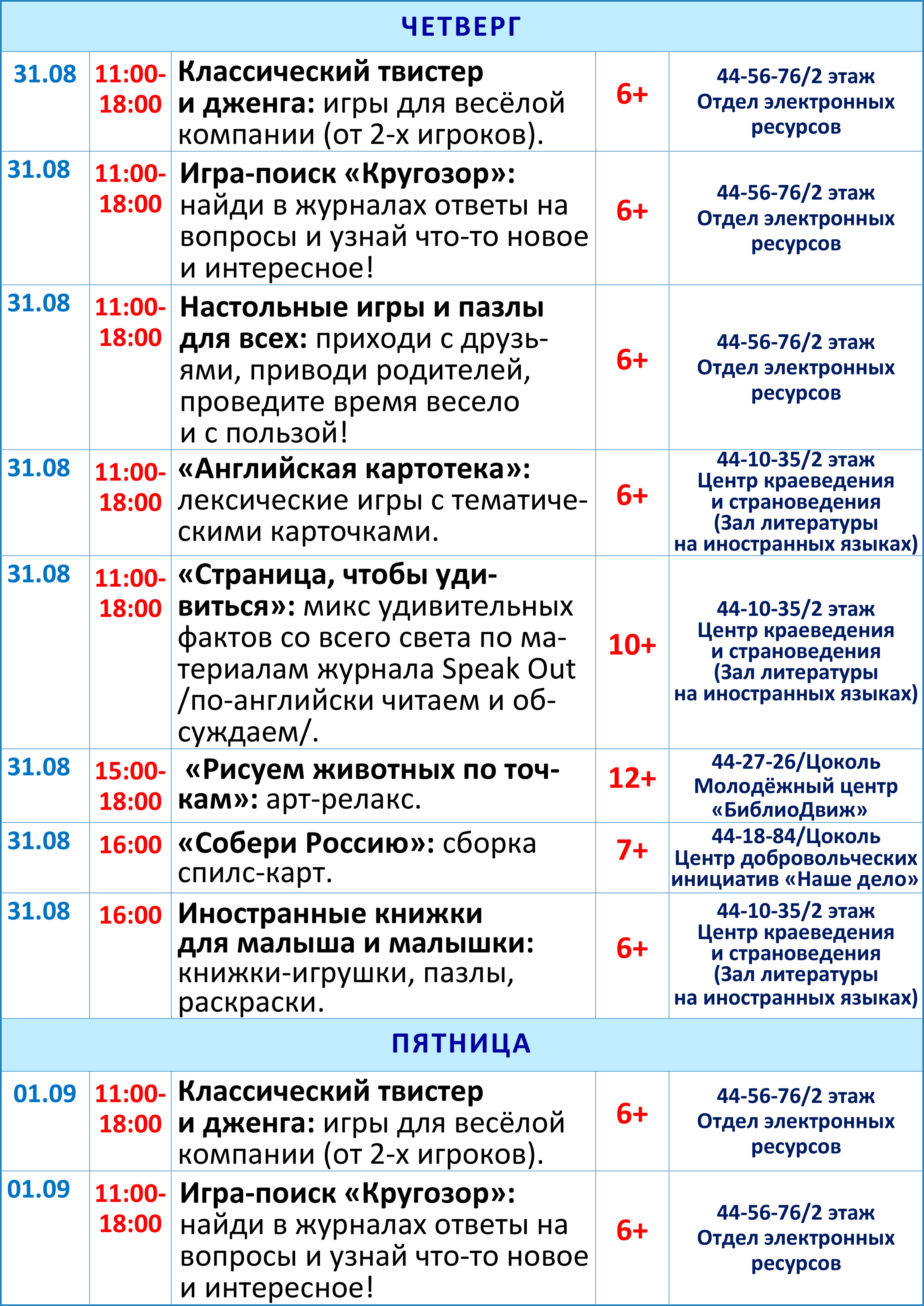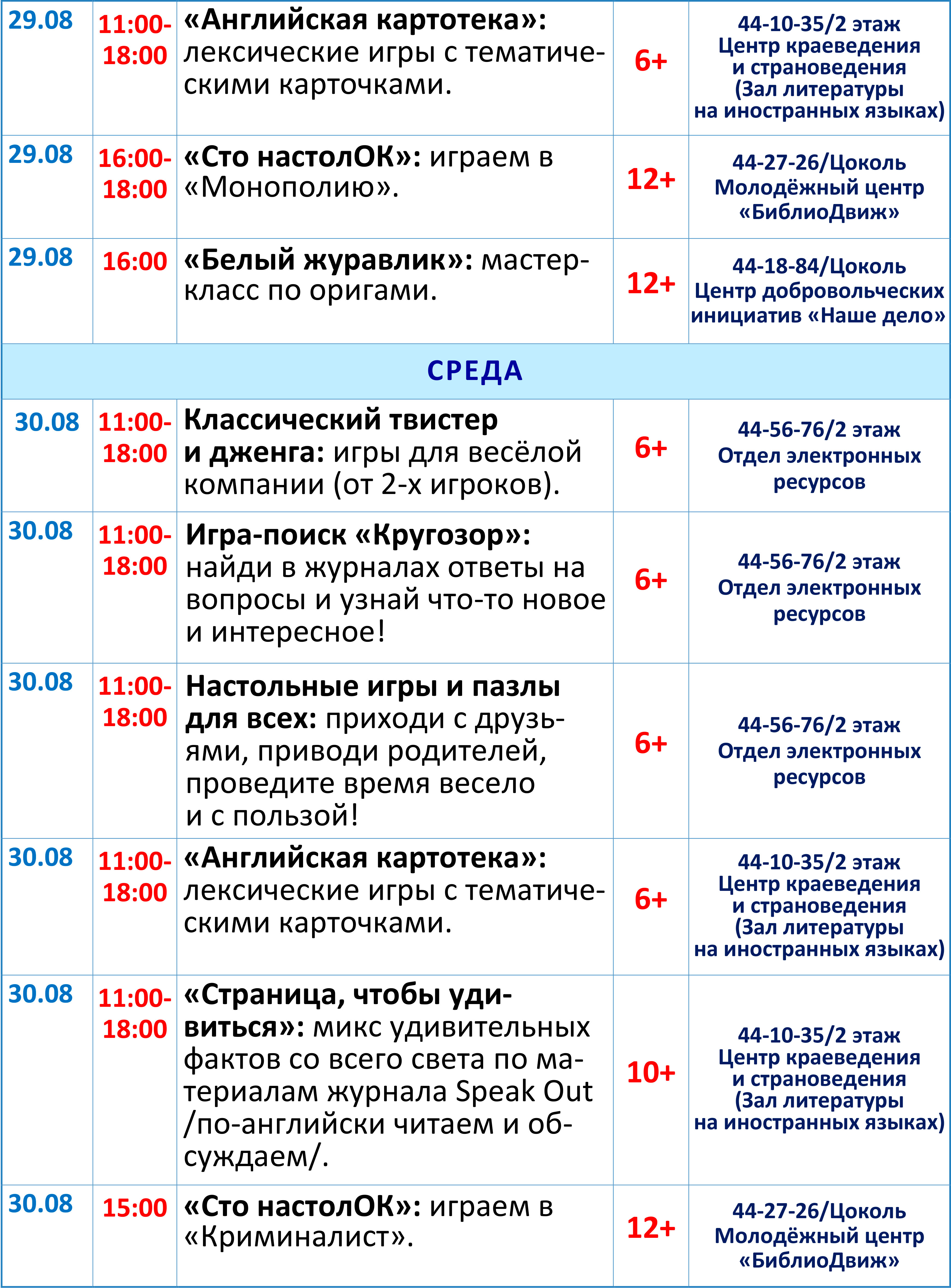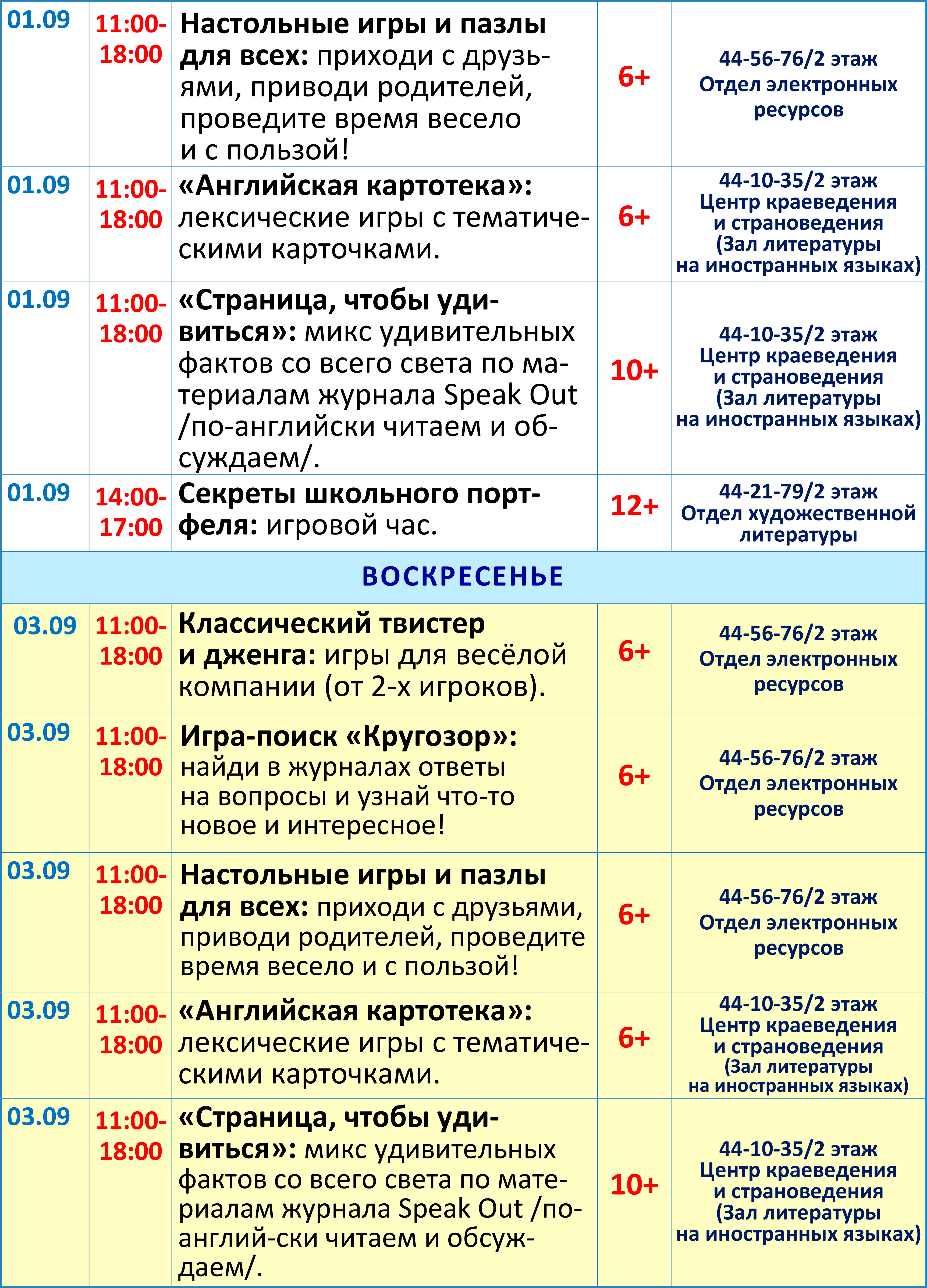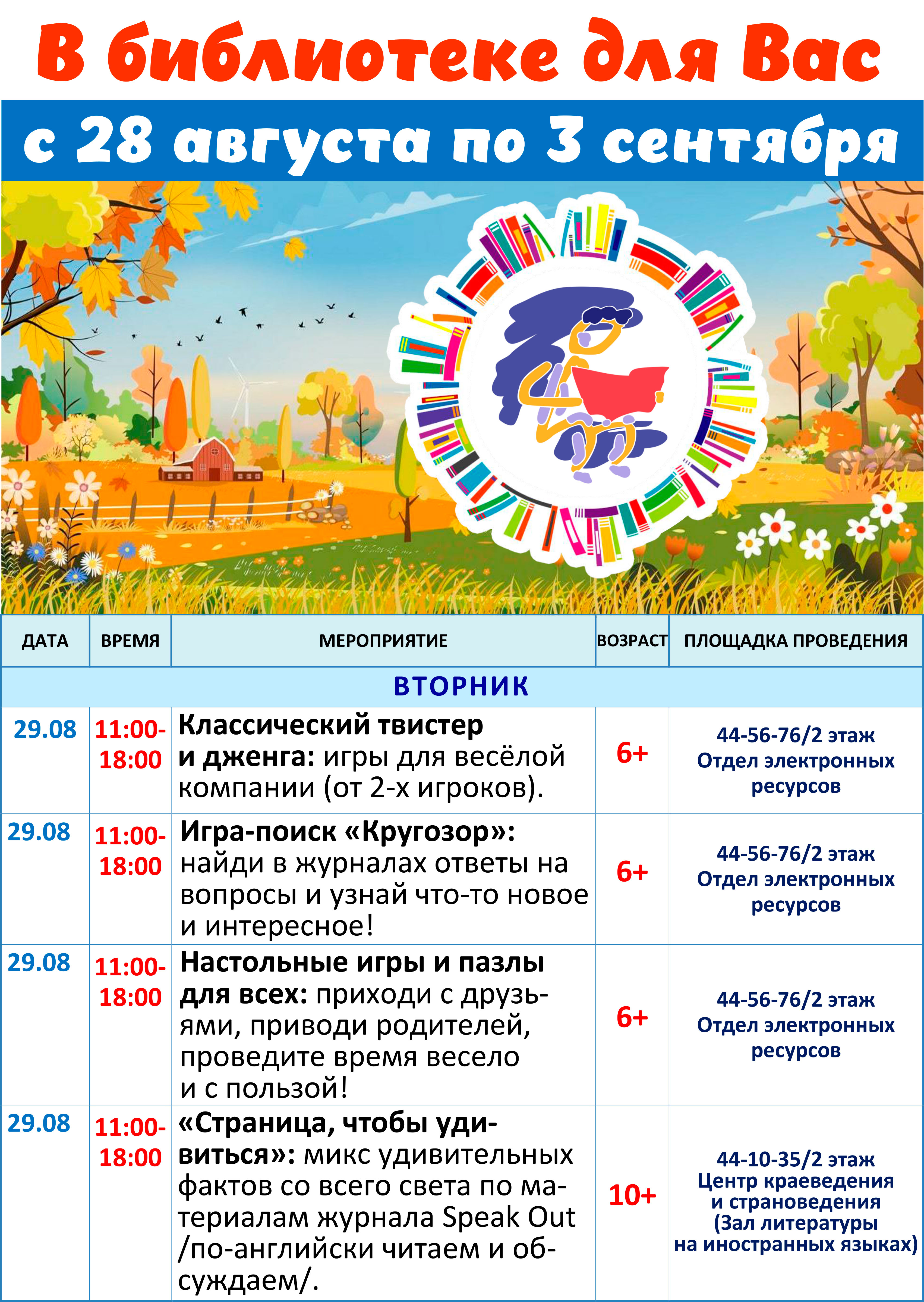 Уважаемые посетители, знакомьтесь с программой мероприятий, которые пройдут в библиотеке с 28 августа по 03 сентября