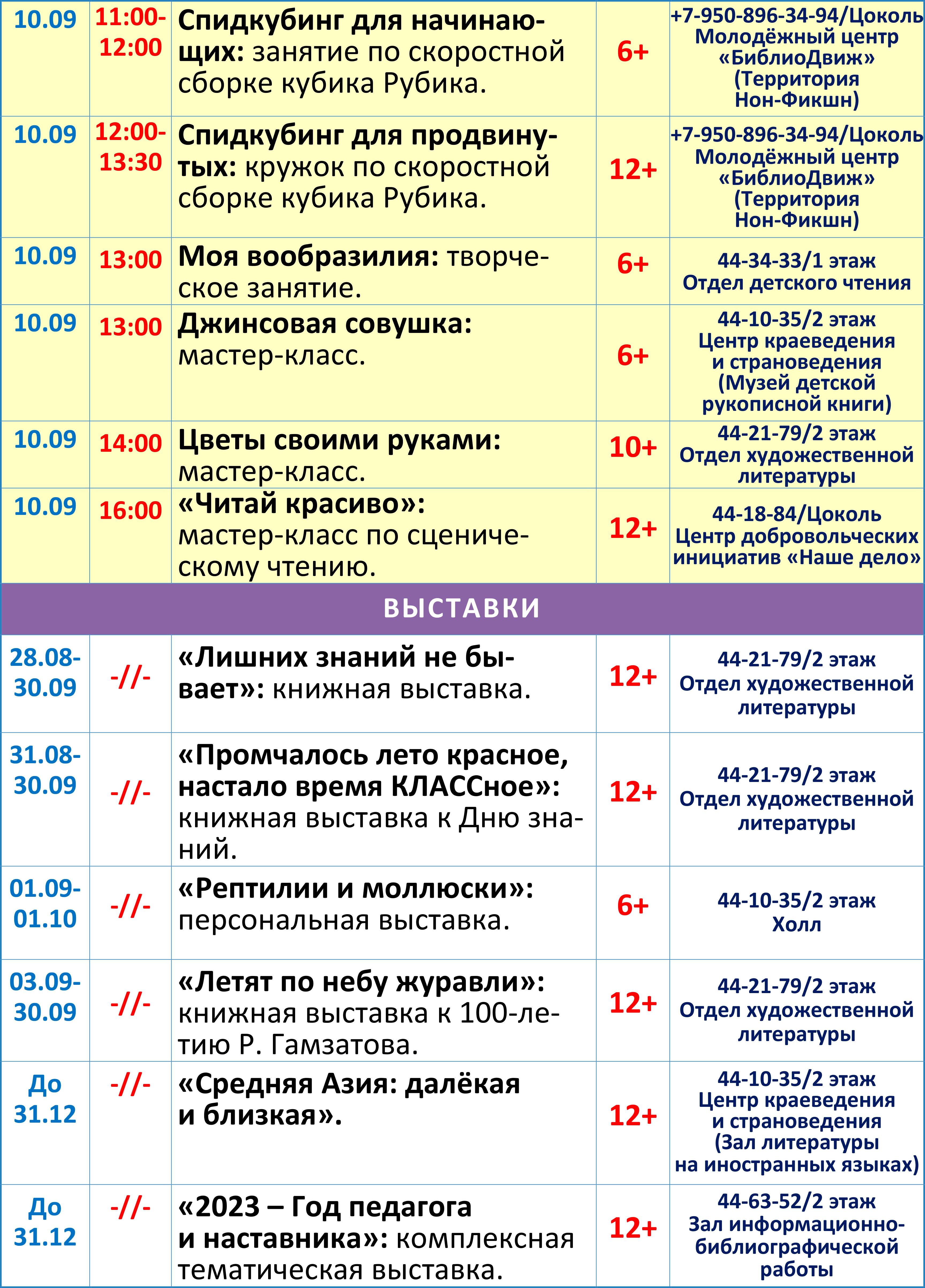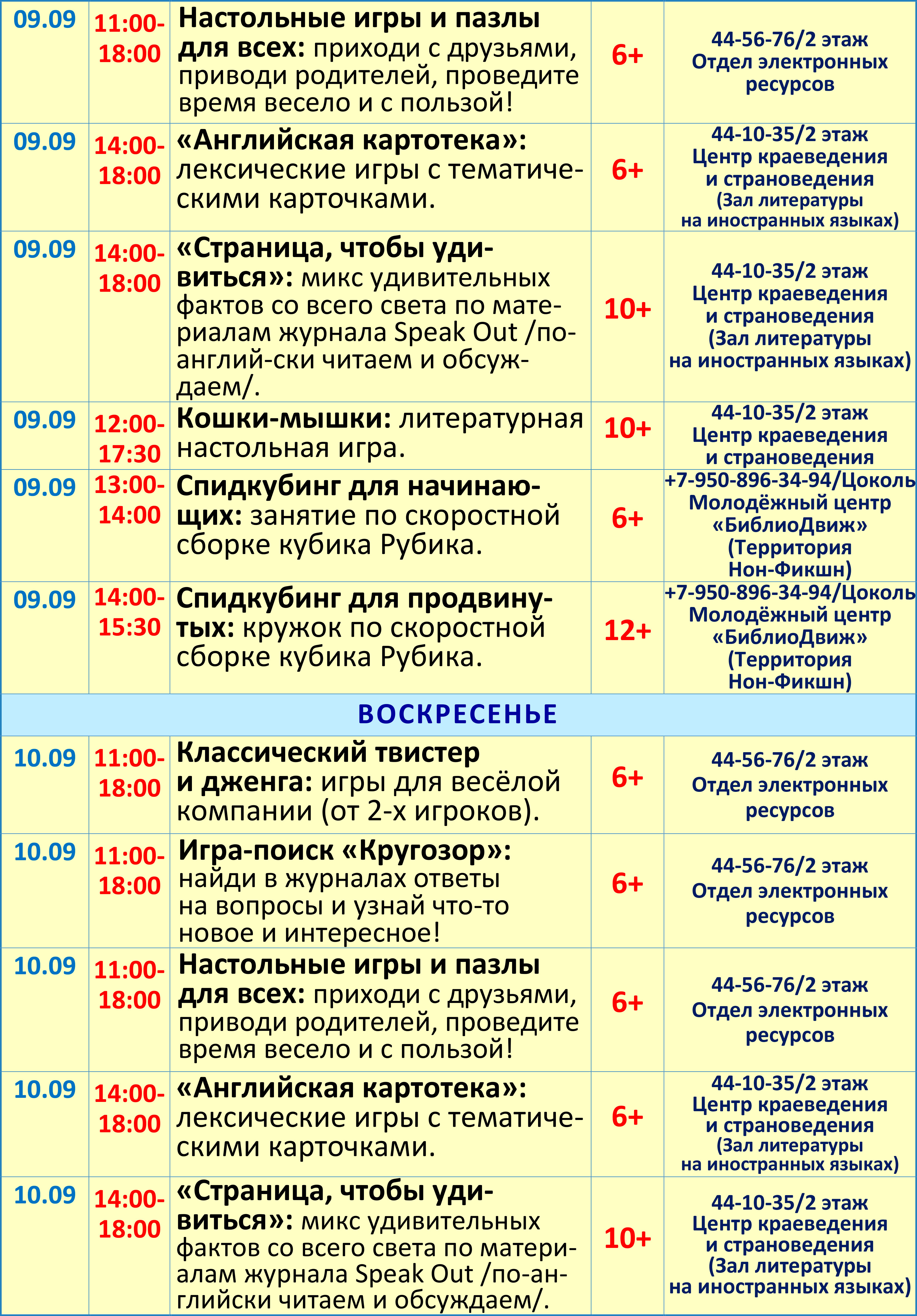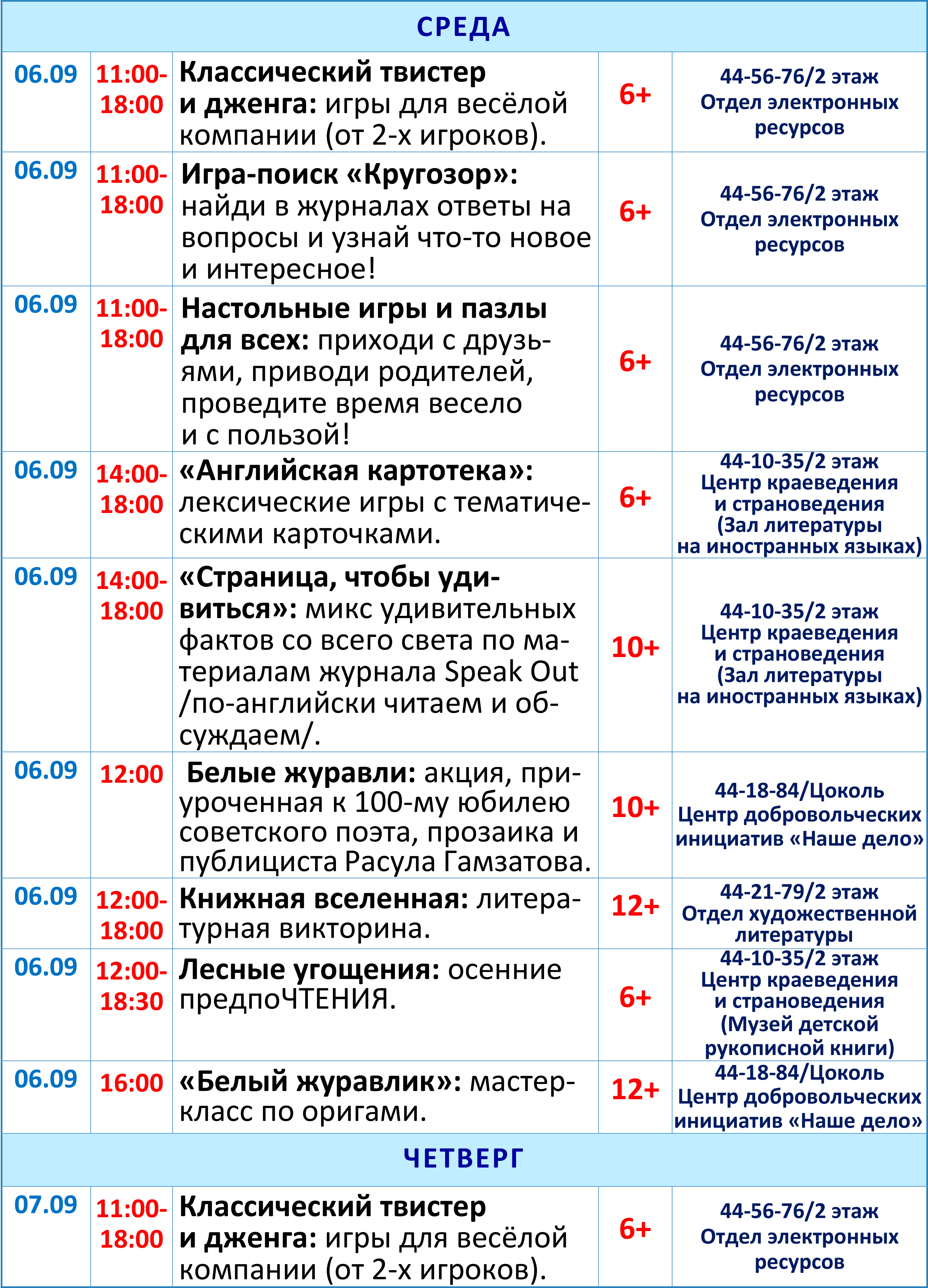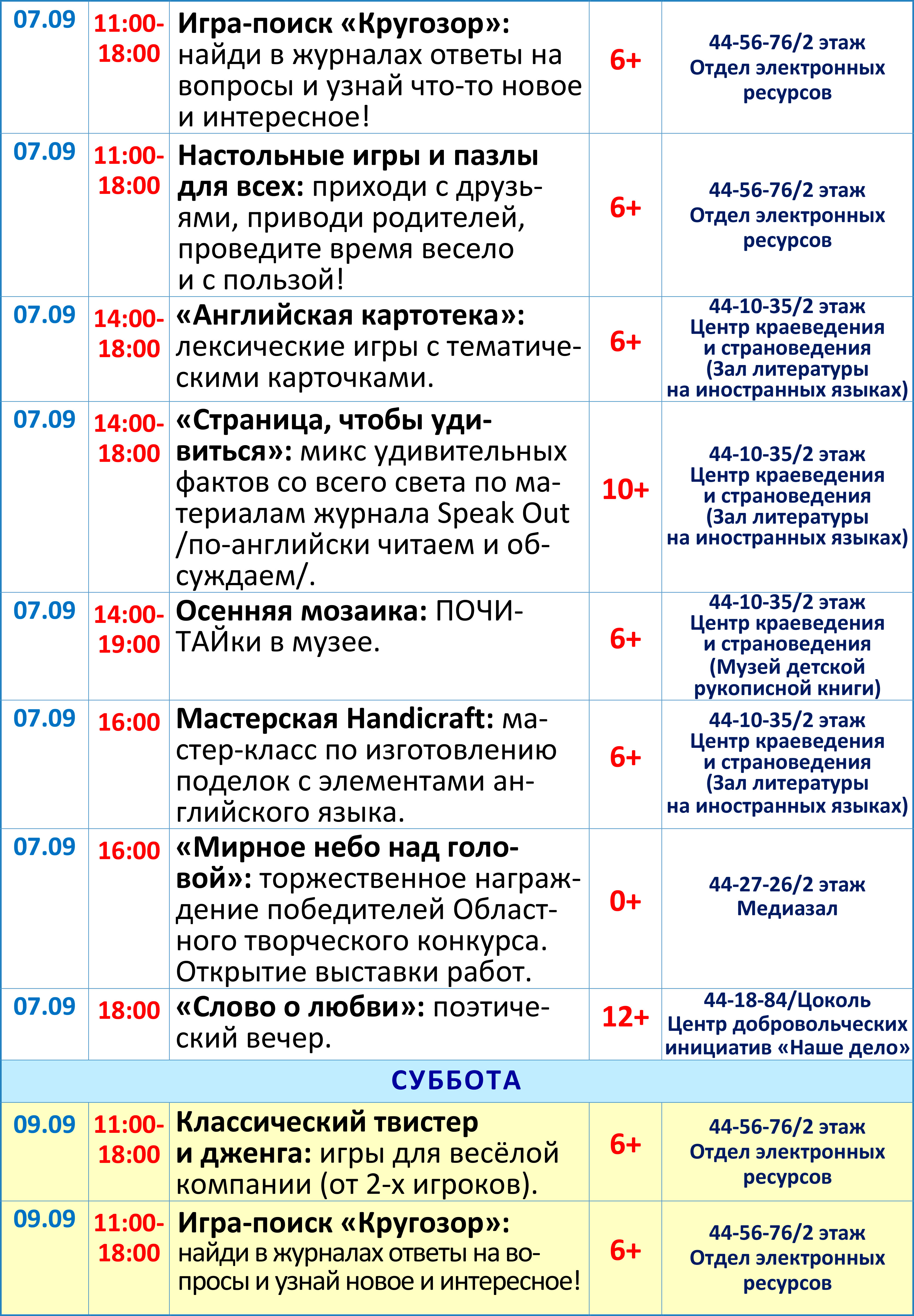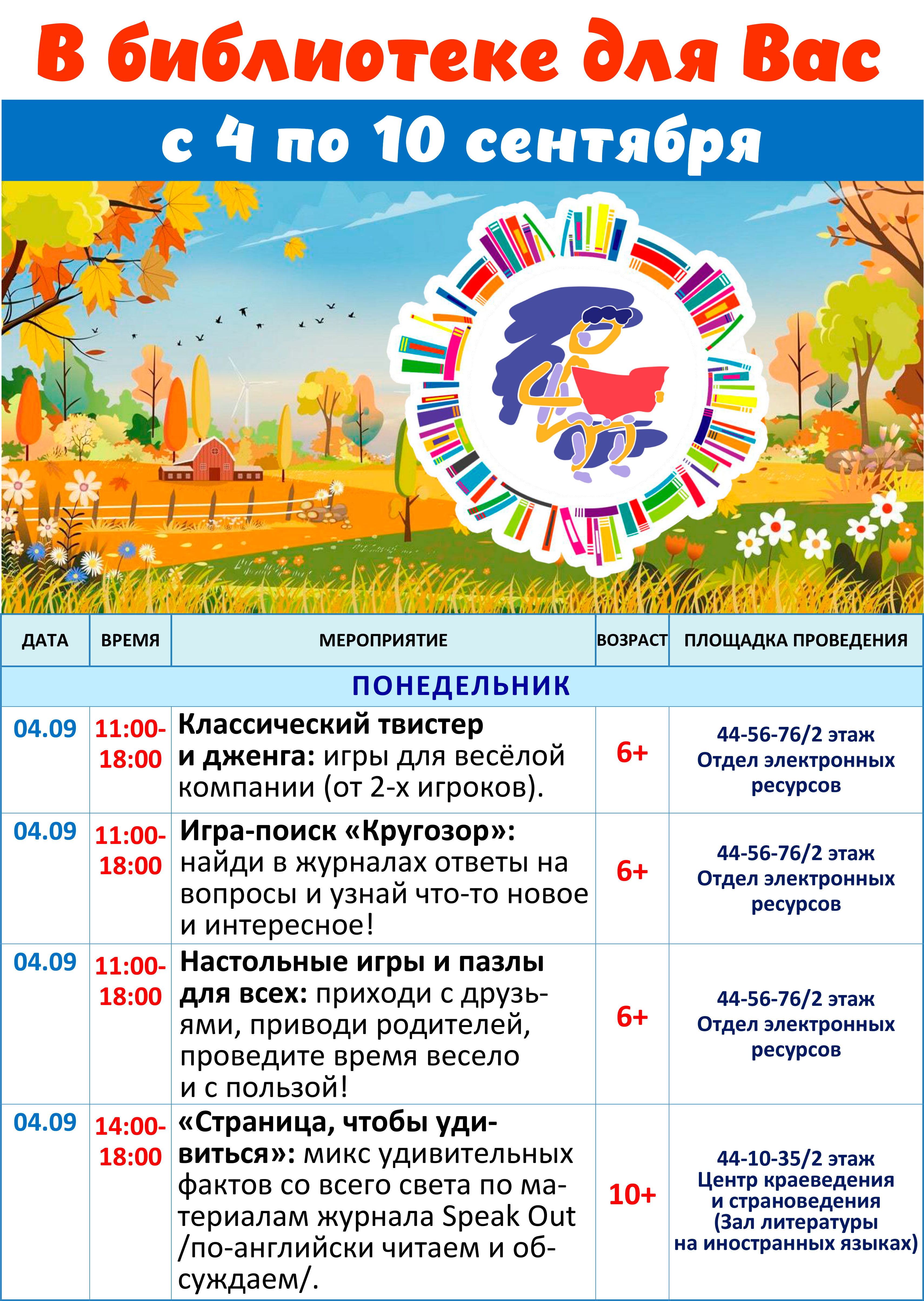 Уважаемые посетители, знакомьтесь с программой мероприятий, которые пройдут в библиотеке с 4 по 10 сентября