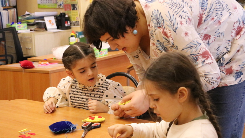 Затем каждый выбрал заготовку, которая больше пришлась по душе, и все вместе приступили к творчеству. Фетр, клей, нитки, иголки, ножницы, наполнитель – всеми материалами ребята были обеспечены на месте. Самым непростым оказалось освоить искусство шитья, но детки очень старались, и в итоге все справились.