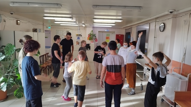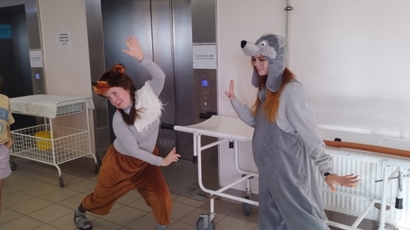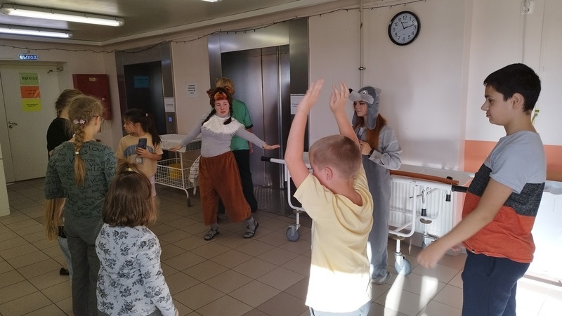 Для юных пациентов был проведен веселый спортивный праздник. Всем известно, что радость и смех помогают скорейшему выздоровлению. Хорошее настроение детям создавали литературные герои Медведь и Волк. Вместе с ними ребята провели спортивную разминку, исполнили веселые танцы и посоревновались в быстроте и ловкости.