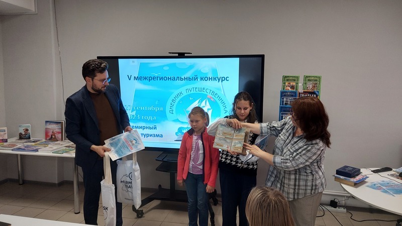 Руководитель Комитета по туризму Мурманской области Елисеев А. В. очень заинтересовался работами участников конкурса. Он отметил, что эта познавательная и творческая деятельность может в будущем помочь школьникам с выбором профессии. Туризм в нашем крае активно развивается, появляются новые маршруты, и юные путешественники могут внести свой вклад. Александр Васильевич рассказал ребятам о «Паспорте полярника», о новых настольных играх о Крайнем Севере и вручил всем победителям Дипломы и подарки.