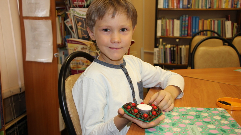 Ребята из картона и пластилина изготовили подсвечник в форме сердца, украсили его ягодами рябины и, конечно же, ароматными зернами кофе. В центре поделки разместили плавающую свечку.