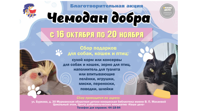 Для этого достаточно приобрести сухие корма или консервы для собак и кошек, зерно для уличных птичек, наполнители для туалетов или впитывающие пеленки, игрушки и другие аксессуары и оставить их в «Чемодане Добра», расположенном на цокольном этаже у центра добровольческих инициатив «Наше дело».