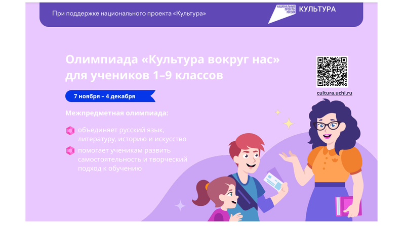 Олимпиада проводится в рамках информационного сопровождения национального проекта «Культура» совместно с Министерством просвещения Российской Федерации, автономной некоммерческой организацией «Национальные приоритеты» и платформой Учи.ру.