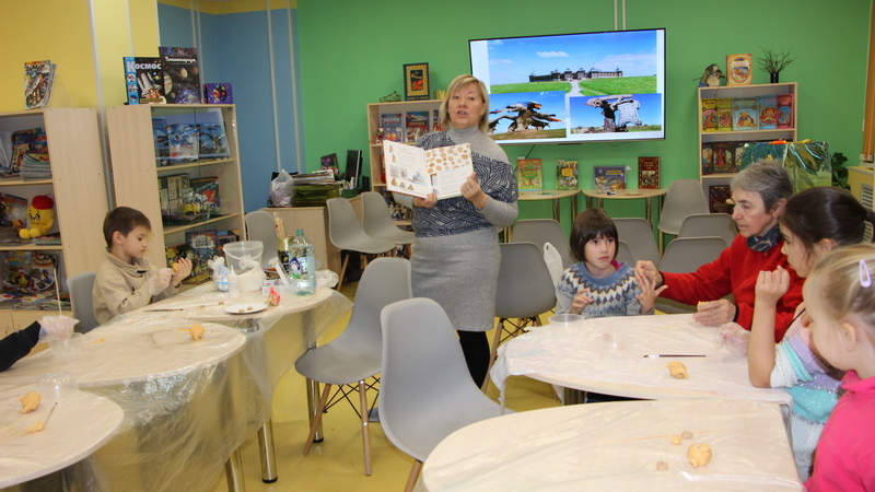 Конечно, первой героиней стала самая известная ведьма из фольклора – Баба-яга, старушка получилась у детворы очень симпатичная. Не менее задорной и прелестной получилась длинноволосая Кикимора. Побывав у нее в гостях, ребята узнали, где ее родина и в каких именно домах она селится. Самым забавным персонажем, с которым повстречались мальчишки и девчонки оказался румяный Колобок, этого героя они слепили из соленого теста и раскрасили на свое усмотрение. А еще во время странствий по сказкам юные читатели участвовали в литературной викторине, выполняли различные задания и просто веселого проводили время!