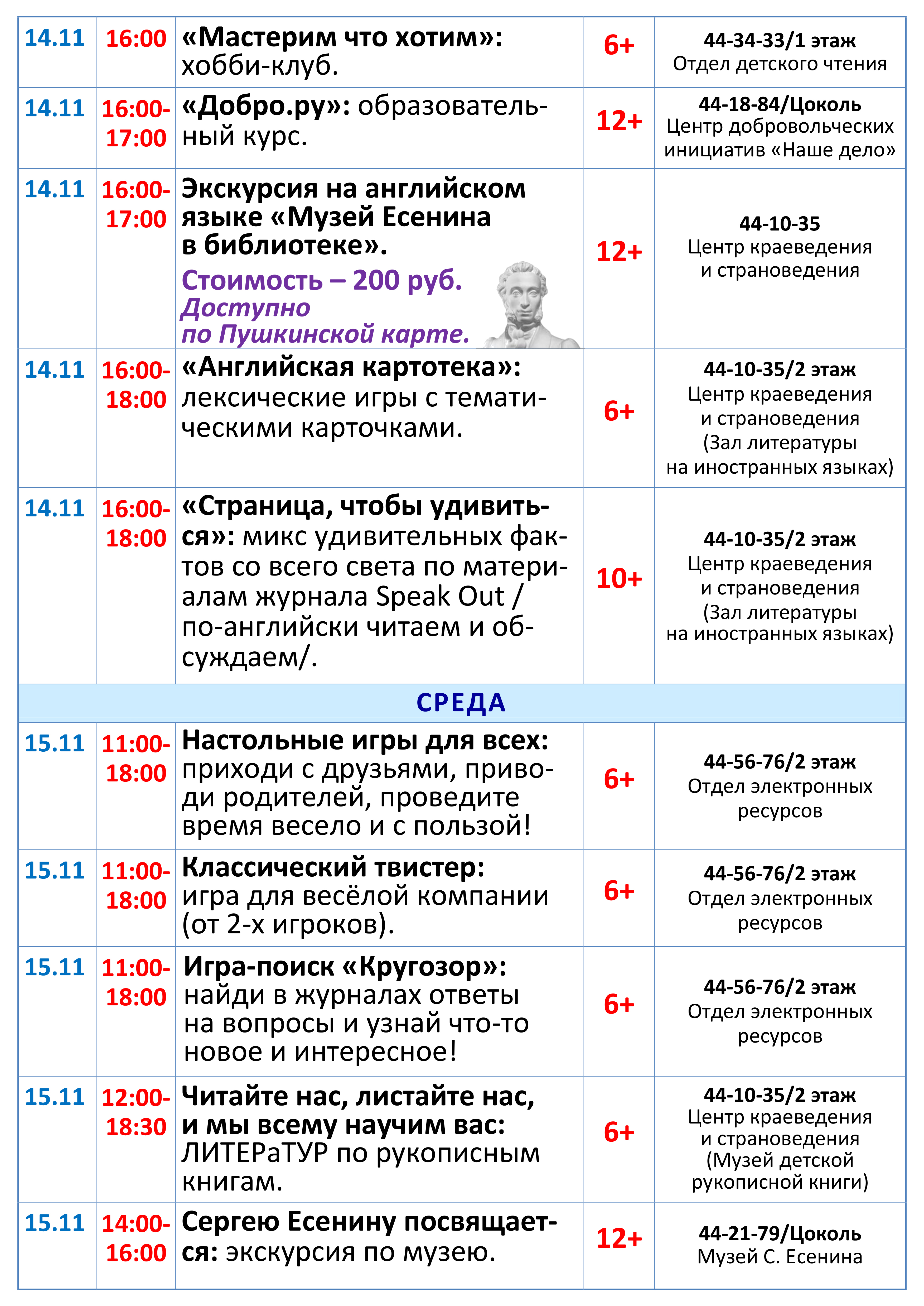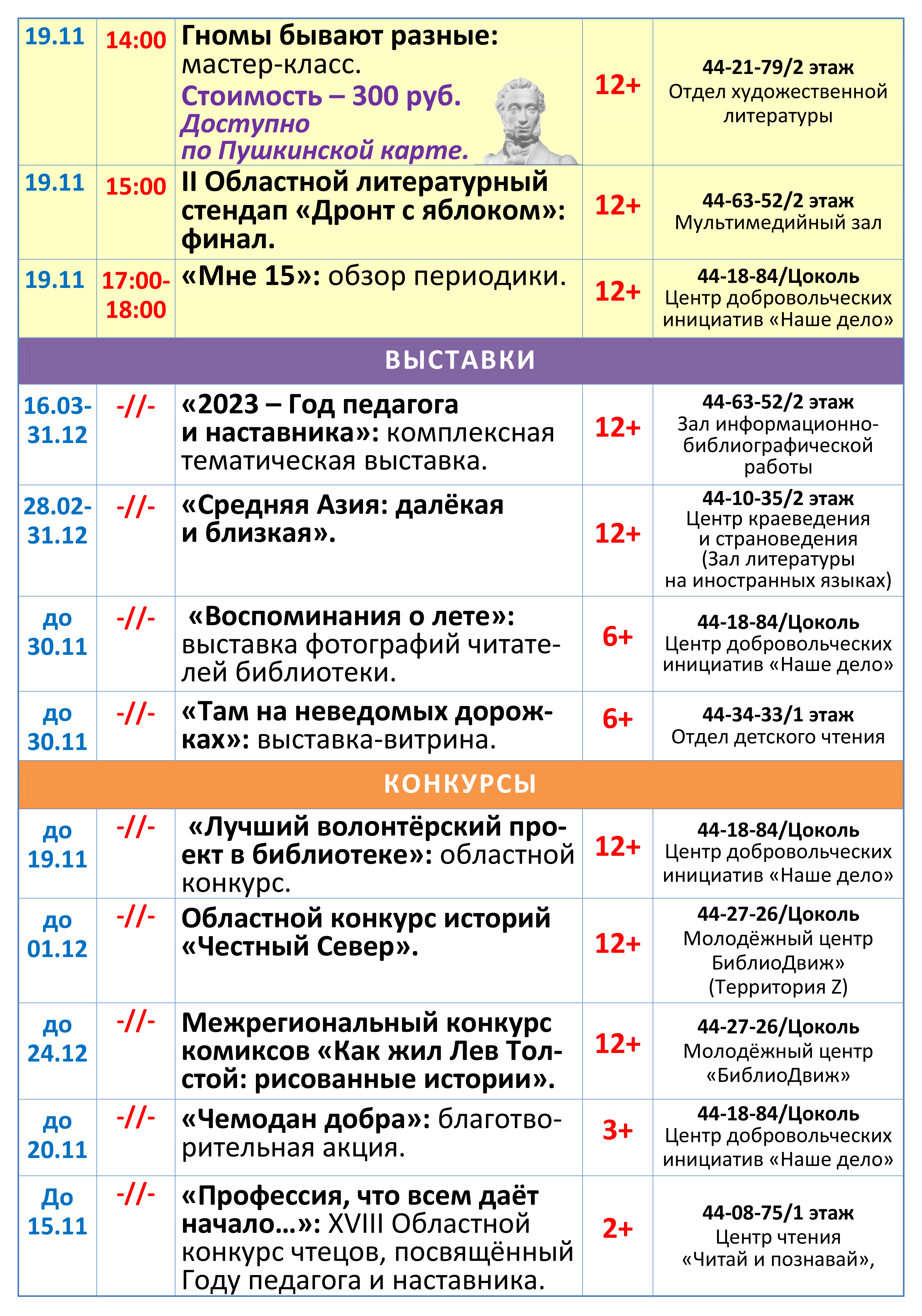 Мурманская областная детско-юношеская библиотека имени В. П. Махаевой приглашает читателей подобрать книгу по настроению, усовершенствовать знания английского языка, посетить интерактивные, познавательные и творческие занятия, выставки, музеи, принять участие в разнообразных играх, конкурсах, увлекательных мастер-классах, в том числе по Пушкинской карте, а также поддержать юных стендаперов на ярком литературном шоу.