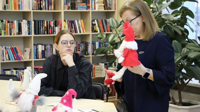 Участники смастерили сказочных умилительных персонажей. Для шитья использовали флисовую ткань разного цвета. Шаловливую неуклюжесть гномику придал ярко-розовый колпак и бубенчик. Рукавички украсили снежинками. Добавили носик из ткани, а для бороды использовали белый длинноворсовый мех. Получился забавный гномик, у каждого свой.