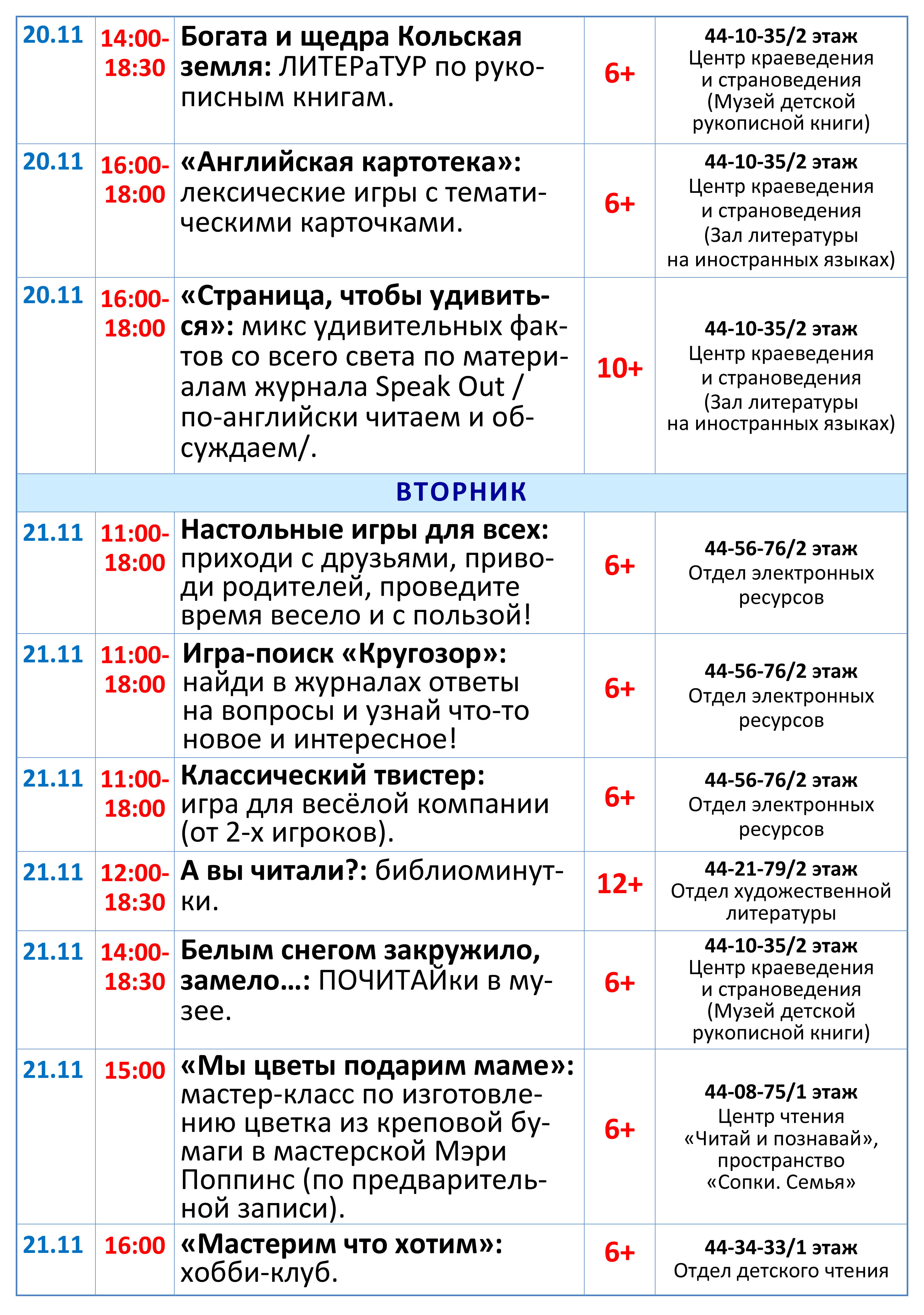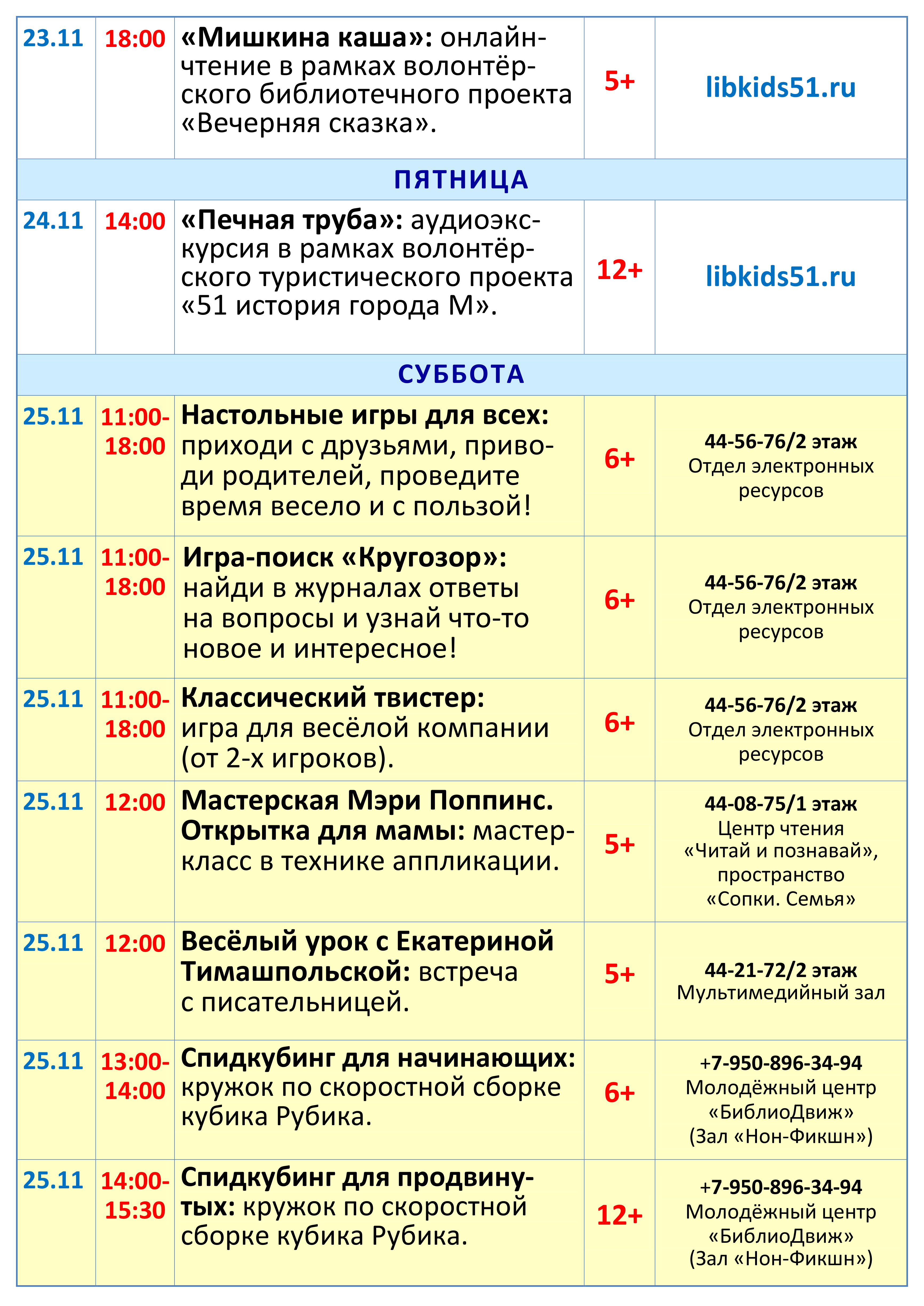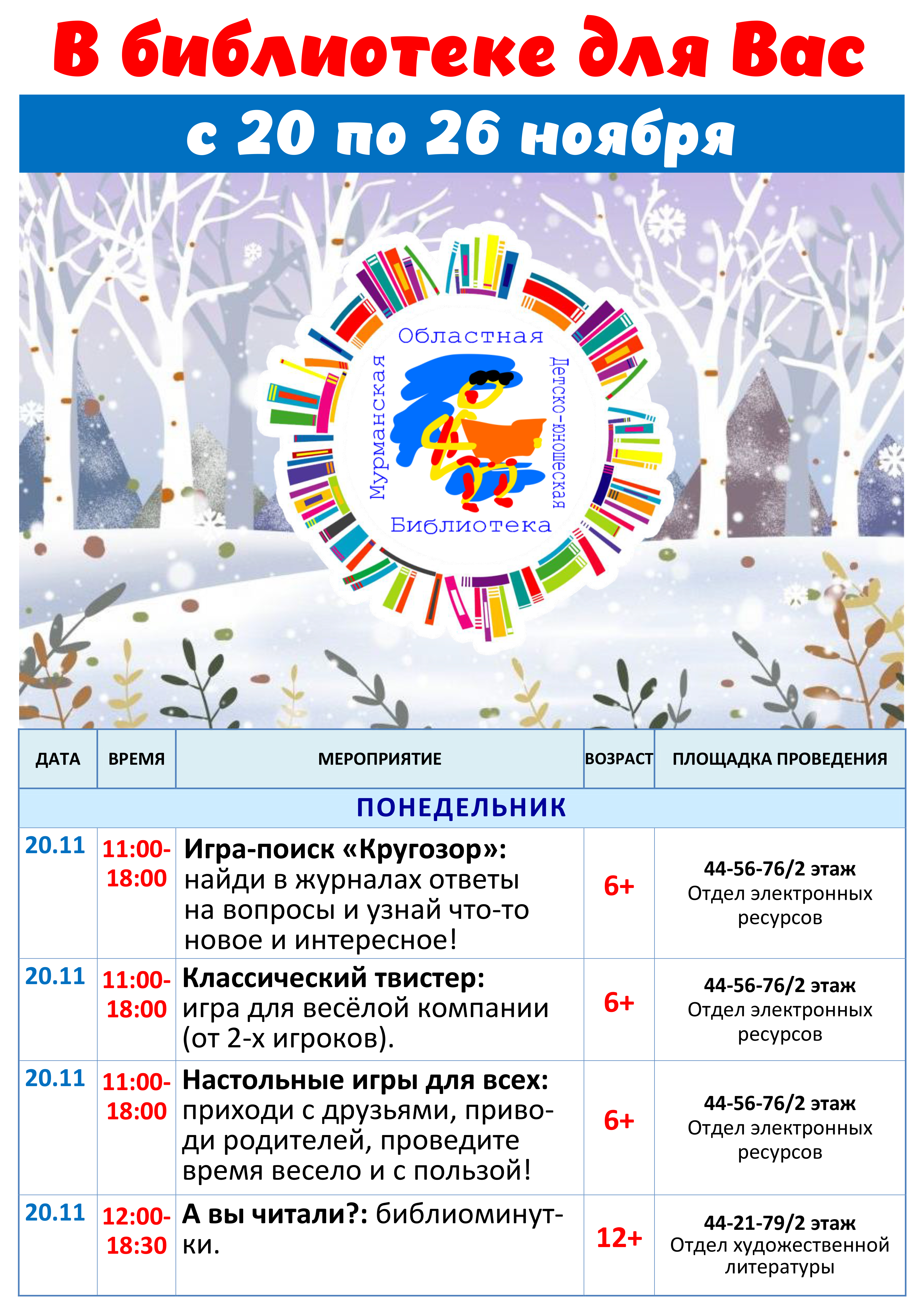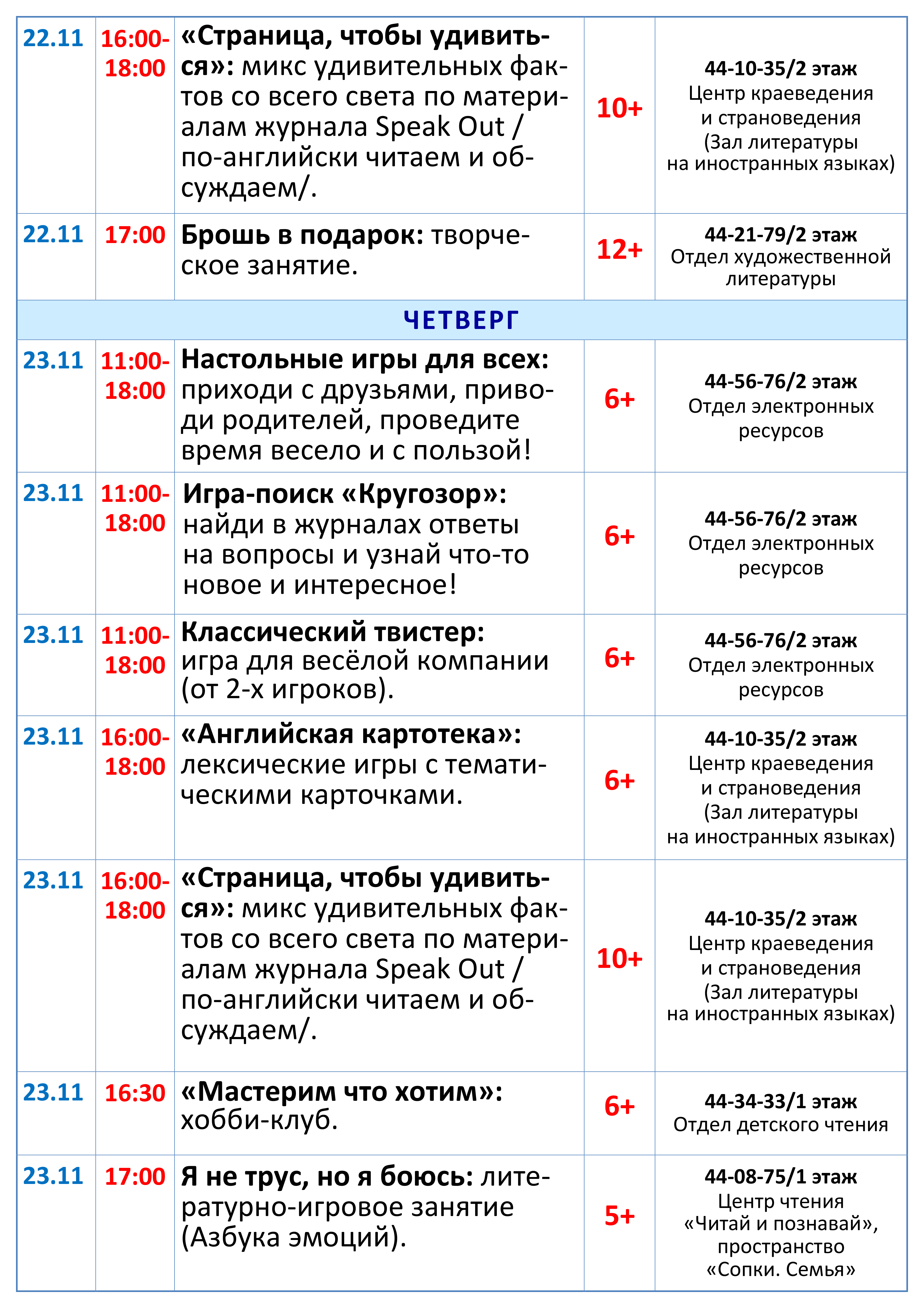 Приглашаем читателей посетить интерактивные, познавательные и творческие занятия, принять участие в разнообразных играх, мастер-классах, совершить литератур по рукописным книгам, познакомиться с новинками периодической печати для подростков и молодежи. Рекомендуем побывать на веселом уроке с писательницей Екатериной Тимашпольской и не пропустить праздничный фестиваль, посвященный 55-летнему юбилею библиотеки! (подробная программа на сайте).