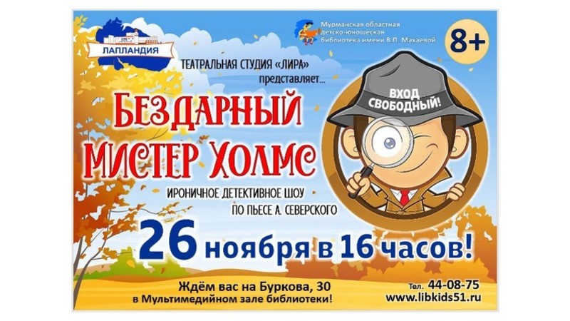 Комическое музыкально-драматическое шоу «Бездарный мистер Холмс» по пьесе А. Северского зрителям представят ребята из театральной студии «Лира» Центра образования «Лапландия».