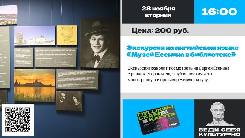 28 ноября с 16:00 до 17:00 сотрудники центра краеведения и страноведения приглашают всех желающих на экскурсию по самому северному музею Сергея Есенина, которая будет проходить на английском языке