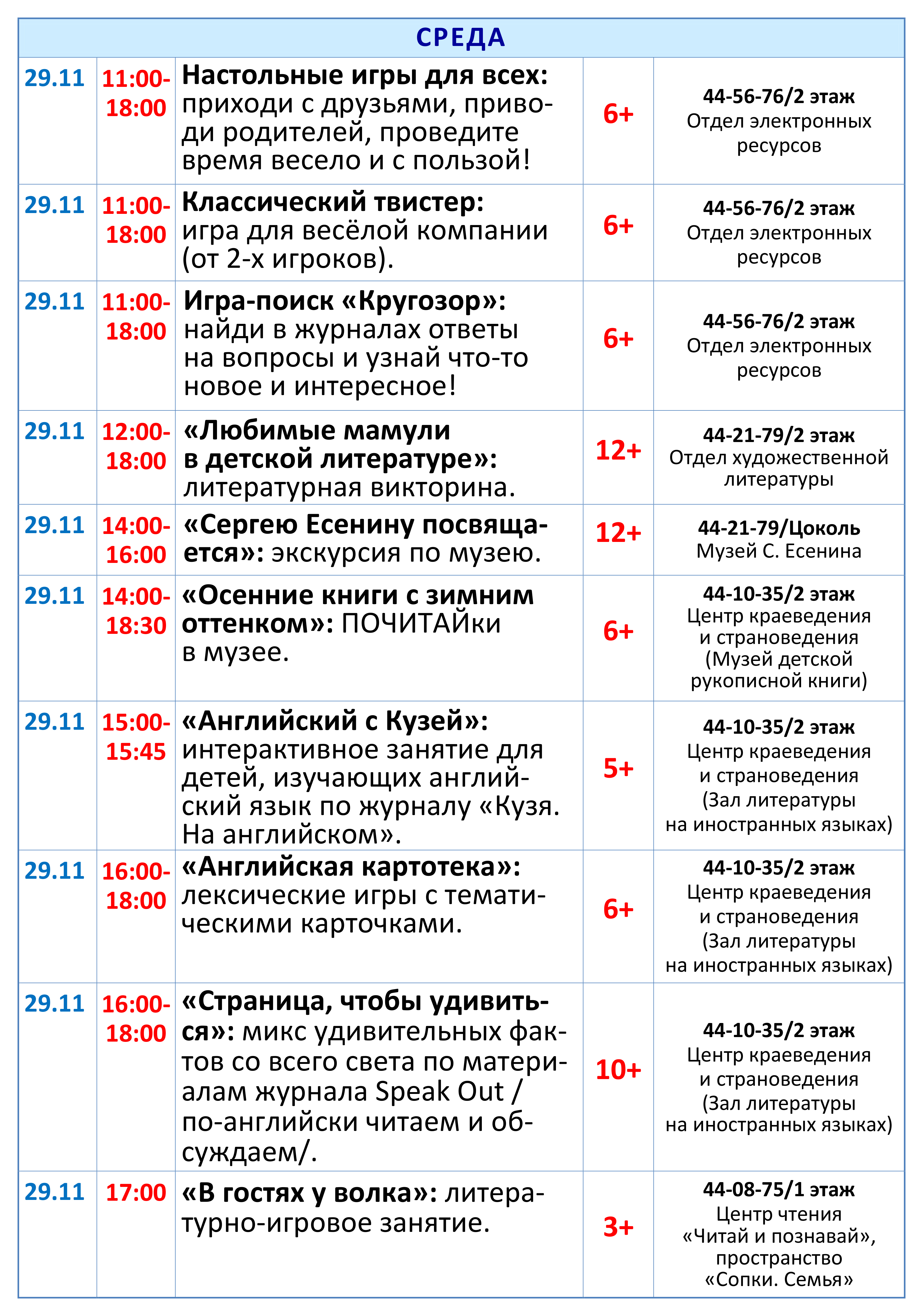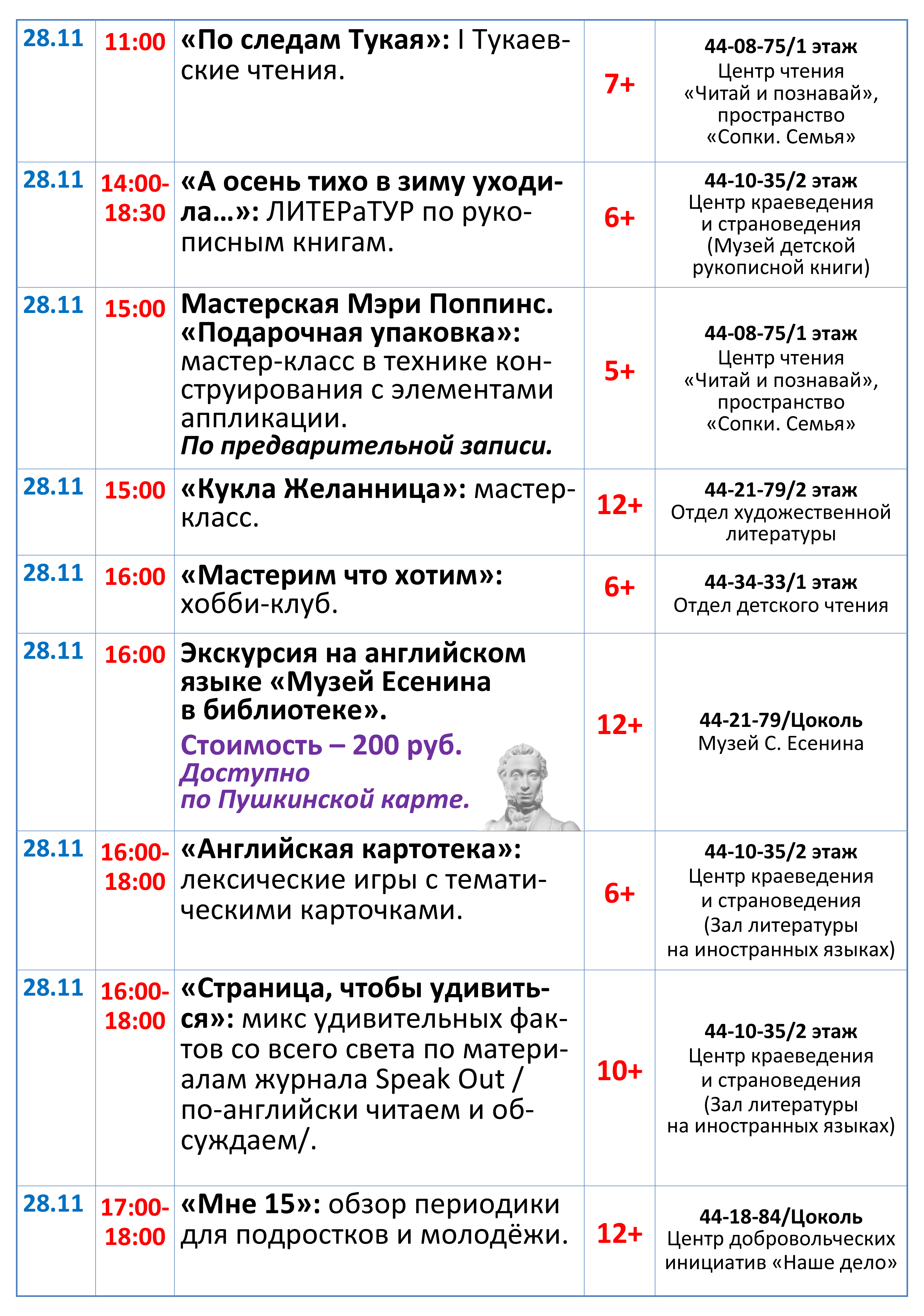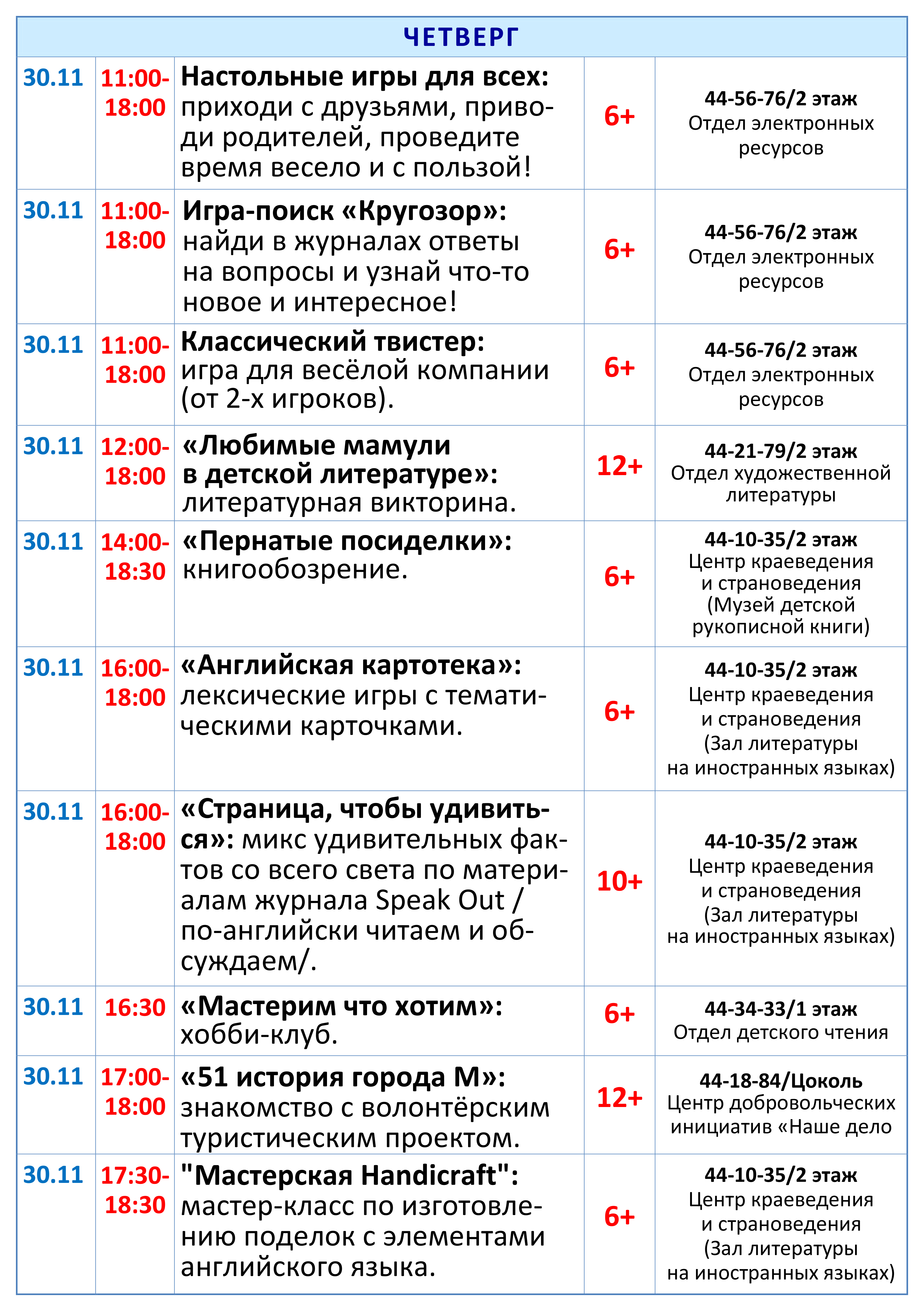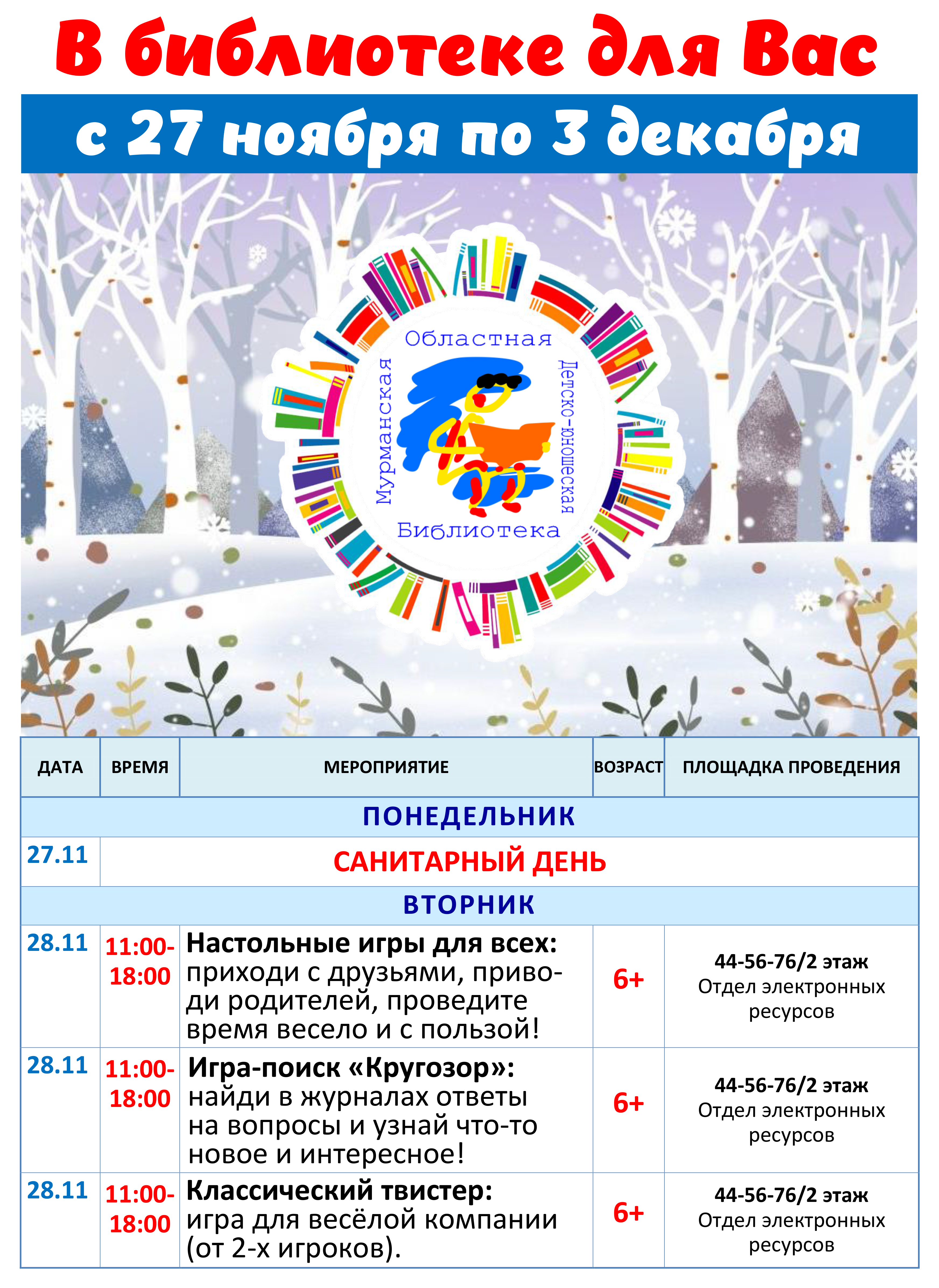 Мурманская областная детско-юношеская библиотека имени В. П. Махаевой (ул. Буркова, д. 30) приглашает читателей познакомиться с книгами о мамочках, сделать им подарки к празднику, посетить интерактивные, познавательные и творческие занятия, выставки, музеи, экскурсии, в том числе по Пушкинской карте, усовершенствовать знания английского языка, принять участие в I Тукаевских чтениях, разнообразных играх, конкурсах, увлекательных мастер-классах, в том числе на английском языке, встретиться с поисковиками отряда «Долина».