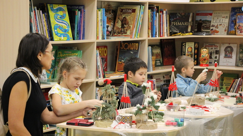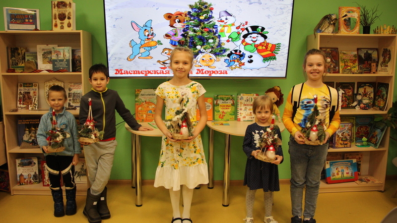 В субботу ребята под руководством сотрудника отдела мастерили елочку красавицу. Из деревянных палочек сделали основание, скрепили красной нитью в технике плетению и украсили декоративными лентами, веточками, снежинками и шариками. Из ваты и бумаги смастерили гномика, надели ему красный колпачок и прикрепили его к елочке.