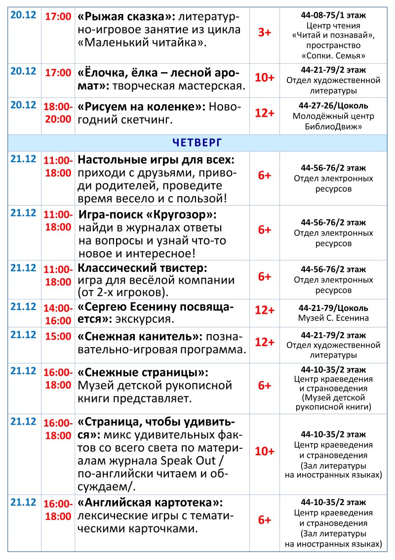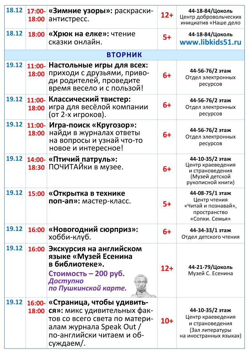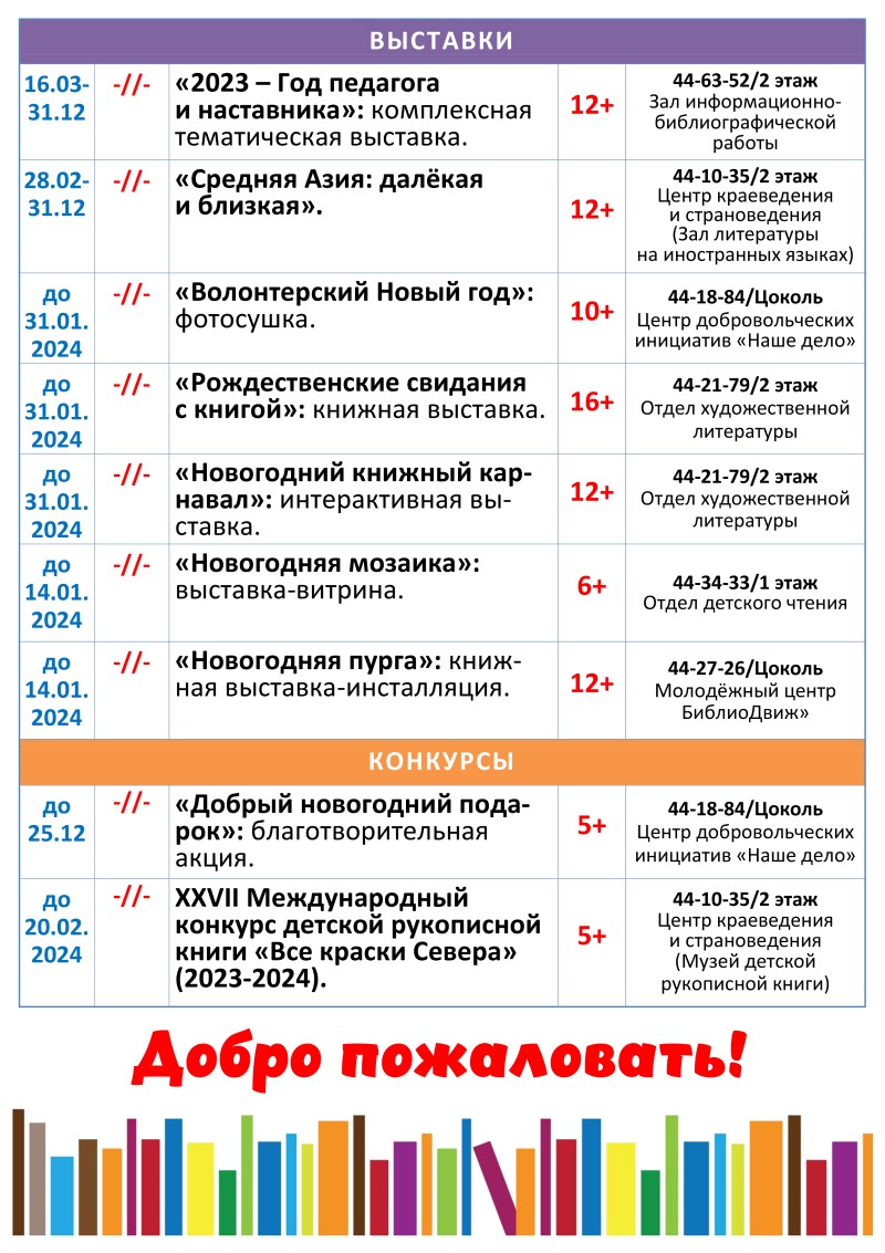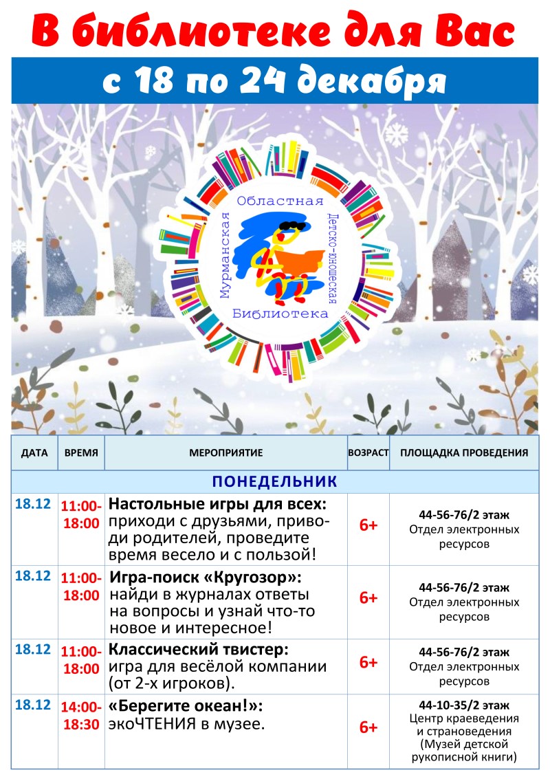 Мурманская областная детско-юношеская библиотека имени В. П. Махаевой приглашает читателей подобрать книги для чтения в новогодние праздники, посетить интерактивные, познавательные, творческие и литературно-игровые занятия, выставки, музеи, экскурсии, в том числе по Пушкинской карте, усовершенствовать знания английского языка, совершить путешествие в страну новогодних игрушек, принять участие в разнообразных играх, конкурсах, увлекательных мастер-классах, подготовиться к празднованию Нового года, а также послушать аудиоэкскурсию.
