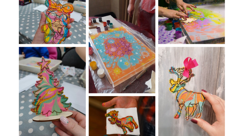 Участники мастер-класса откроют для себя эбру – технику рисования на воде. Маленькие читатели и их родители не только узнают о её истории, инструментах, материалах и способах изображения, но и создадут свой уникальный магнитик или ёлочку на подставке!