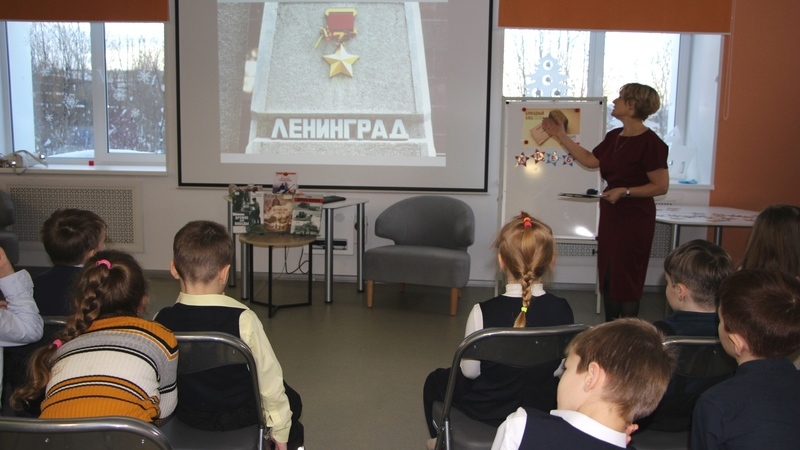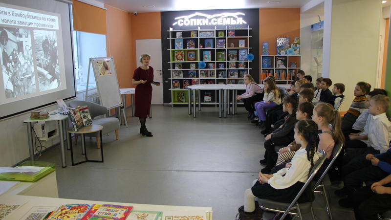 Библиотекарь рассказала, как жилось в Ленинграде во время блокады. Первоклассники услышали звук метронома и сигнал «Воздушная тревога», оповещавший жителей Ленинграда о налёте вражеской авиации.