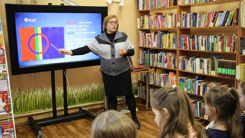 На тематическом занятии библиотекарь рассказала школьникам, где сегодня проживают саами, а также все внимательно рассмотрели флаг и послушали гимн саамского народа. Ребятам было интересно послушать о традиционной одежде и занятиях народа саами. Они рассмотрели на экране и в рукописной книге различные виды традиционного жилья, а также познакомились с героями саамских сказок. С интересом школьники посмотрели мультфильм, созданный по саамской народной сказке «Богатый да скупой, бедный да щедрый».