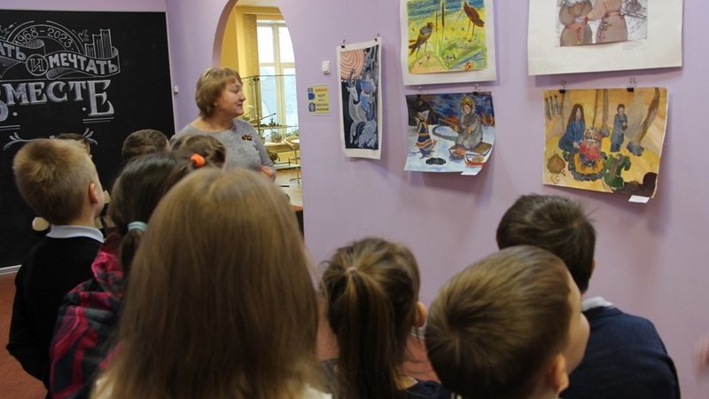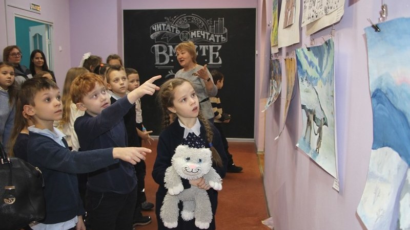 В заключение мероприятия второклассники посетили выставку рисунков учащихся Детской художественной школы «Поющий ветер тундры», разместившейся в холле 2 этажа библиотеки. На рисунках ребята с удовольствием находили уже знакомые им предметы и героев сказок.