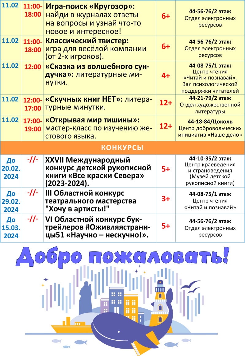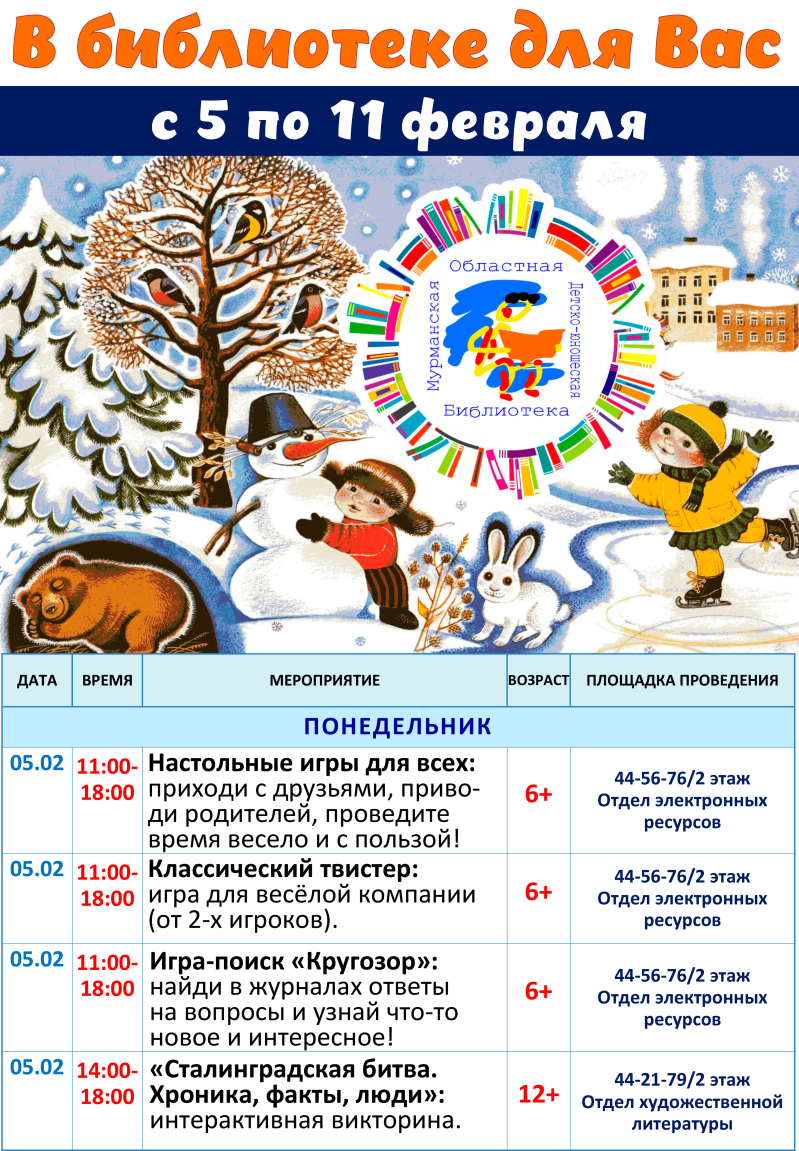 Мурманская областная детско-юношеская библиотека имени В. П. Махаевой приглашает читателей подобрать книги для чтения, посетить интерактивные, познавательные, творческие и литературно-игровые занятия, выставки, музеи, экскурсии, принять участие в разнообразных играх, конкурсах, увлекательных мастер-классах, в том числе на английском языке.