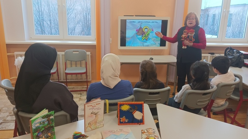 В рамках цикла занятий дети познакомились с культурой и бытом коренного народа Мурманской области – саами. Удивительно было узнать, что этот народ проживает на территории четырех стран, а флаг у них один. Ребят поразило, какую важную роль в жизни саама играет олень. Помогли в этом и привезенные библиотекарями рукописные книги.