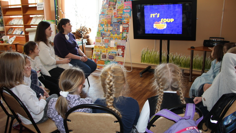 В завершение занятия дети посмотрели обучающий мультфильм на английском языке из серии Magic English. Нелепые ситуации, в которые попадали герои, рассмешили всех, а слова и фразы, звучащие с экрана, помогли повторить усвоенный материал.