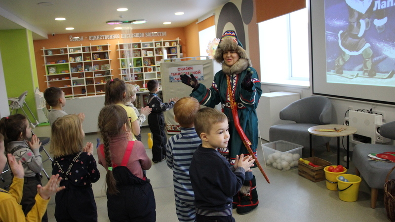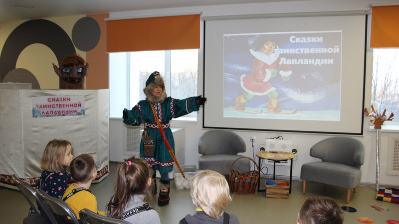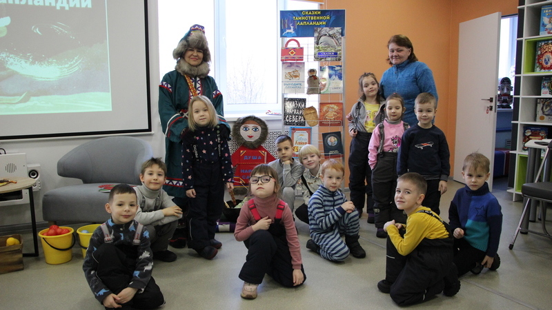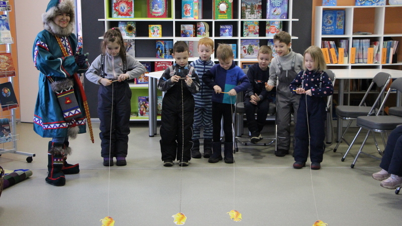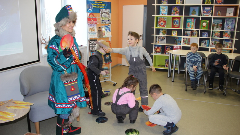 Библиотекарь прочитала несколько эпизодов из книги писателя и под звук шагов по снегу, появился костюмированный герой Сампо-Лопаренок. Вместе с отважным мальчишкой ребята выполняли задания злого великана Хийси. Дети собирали северные ягоды, ловили рыбу, участвовали в конкурсе на меткость, наперегонки катались на оленях. В результате участники победили коварного великана и дождались появления солнца. Так весело и познавательно дети познакомились еще с одной книгой!