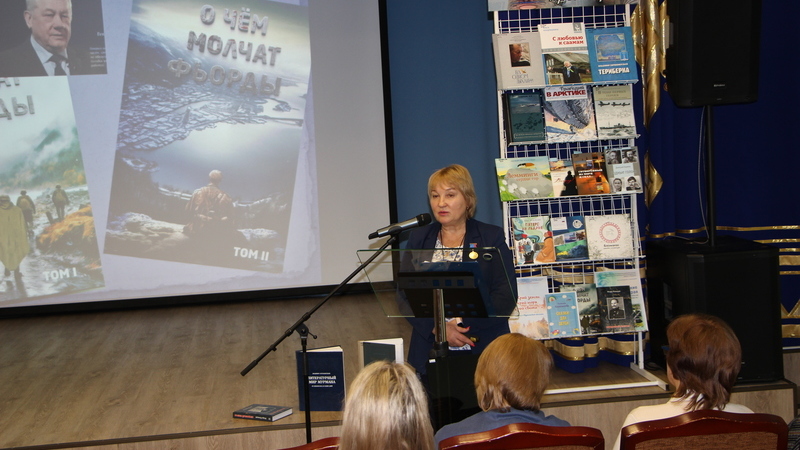 Заведующая центром краеведения и страноведения Людмила Григорьевна Коновалова познакомила всех присутствующих с книгами Геннадия Гурылева «О чем молчат фьорды». Это двухтомник о событиях 1940-х годов на территории Советского Заполярья и Норвегии. Вниманию гостей был представлен юбилейный альбом к 70-летию скульптора Александра Геннадьевича Арсентьева «На одном дыхании». Работы скульптора известны всем мурманчанам: это и «Памятник воинам Полярной дивизии», и монументы «Долины Славы», и бюсты на «Аллее писателей» у центрального входа нашей библиотеки.