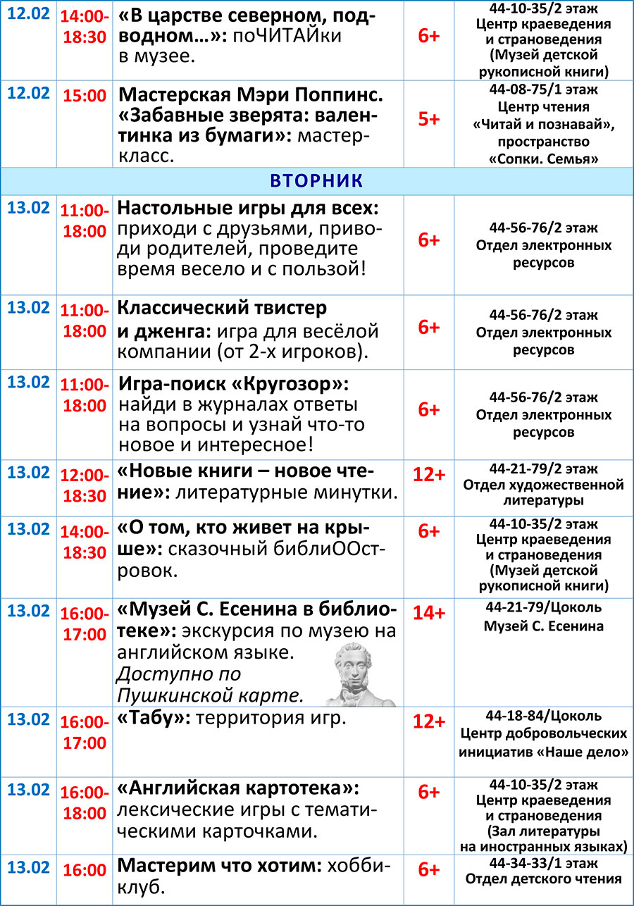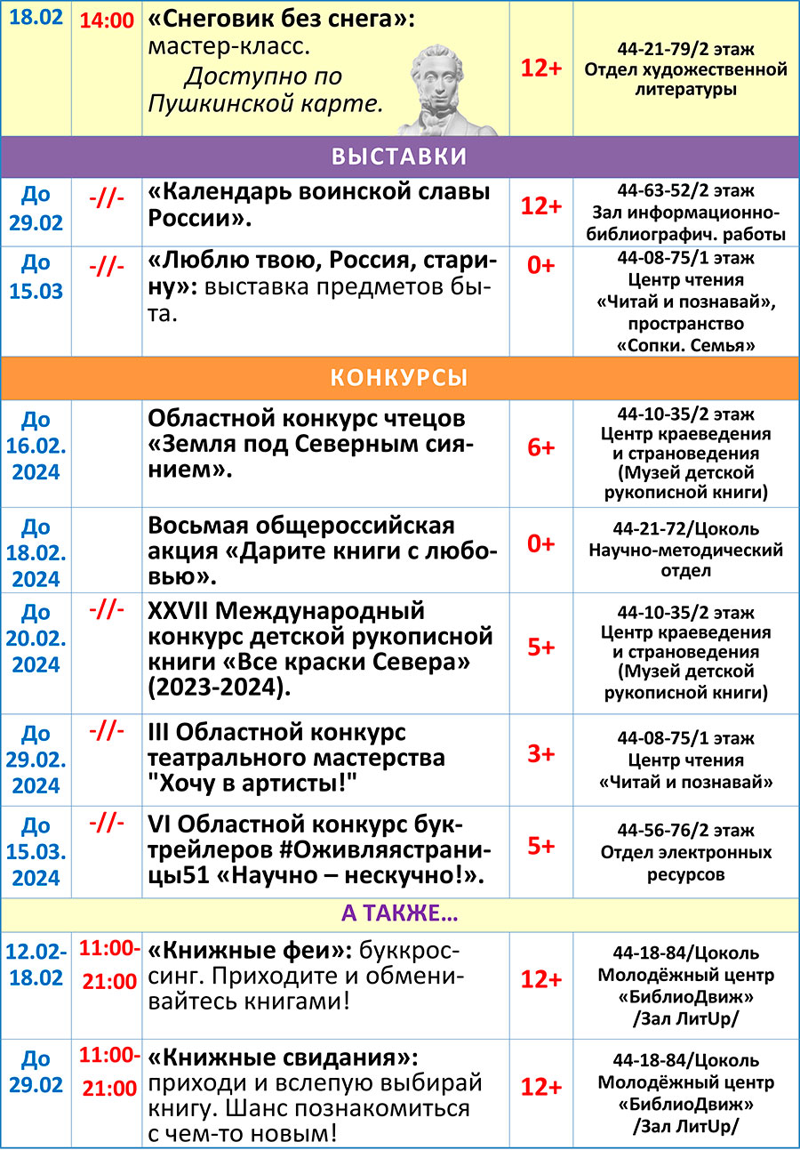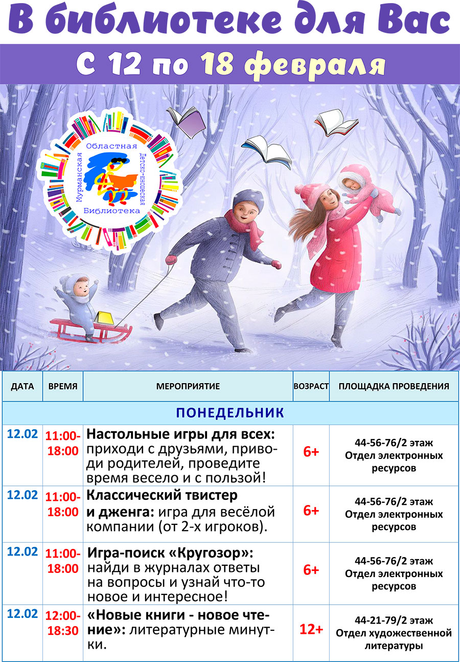 Мурманская областная детско-юношеская библиотека имени В. П. Махаевой приглашает читателей подобрать книги для чтения, посетить интерактивные, познавательные, творческие и литературно-игровые занятия, выставки, музеи, экскурсии, в том числе по Пушкинской карте, принять участие в разнообразных играх, конкурсах, увлекательных мастер-классах.