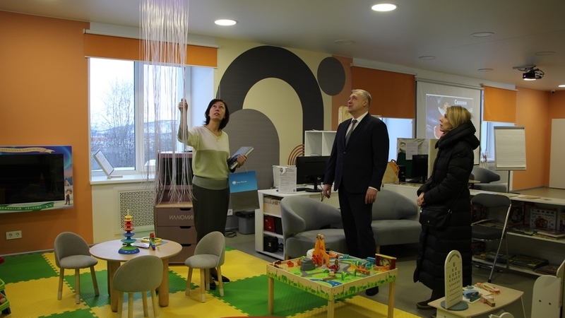 После торжественной части директор библиотеки Наталья Владимировна Феклистова познакомила гостей с недавно открывшимся пространством СОПКИ.СЕМЬЯ. Здесь проходят разноплановые мероприятия, в том числе занятия по финансовой грамотности, которые проводят специалисты Отделения Банка России по Мурманской области. Уютное помещение, яркая игровая зона и современное интерактивное оборудование восхитили Юрия Михайловича.