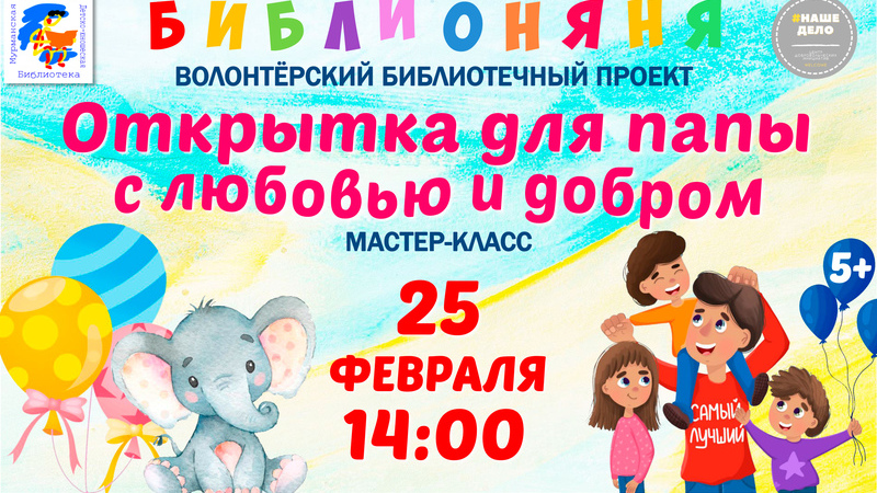 Вместе с волонтерами библиотеки юные читатели создадут необычный трогательный подарок для папы. Открытка будет выполнена с применением различных техник: напыления, аппликации и скапбукинга. Встреча состоится в рамках волонтерского библиотечного проекта «Библионяня».