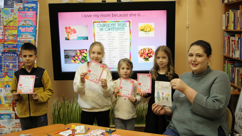 В конце записали, прочитали и перевели небольшое поздравление. Повторили его несколько раз, чтобы каждый смог порадовать свою маму прочтением этого четверостишия. И, наконец, «на десерт» украсили открытку рисунками, аппликациями и по-весеннему яркими наклейками.