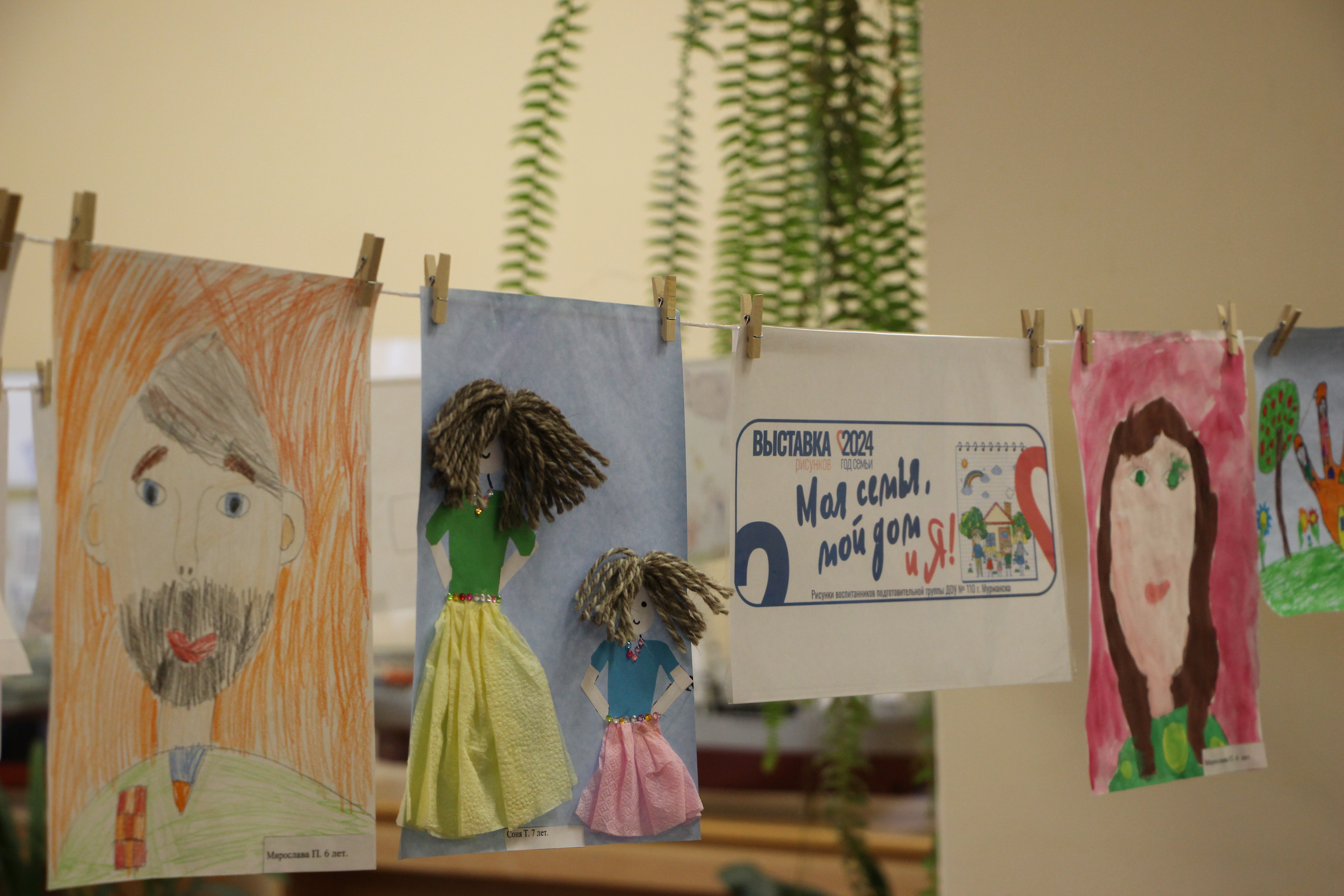 В зале в формате «фотосушки» размещена выставка детских рисунков воспитанников ДОУ № 110 г. Мурманска на тему «Моя семья, мой дом и я».
