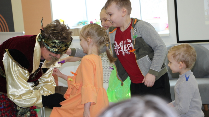 На праздник к ребятам пожаловал ужасный Бармалей и похитил все книжки с выставки. Но наши юные читатели не испугались сказочного злодея, а смело и весело состязались с ним в увлекательных конкурсах и играх! Мальчишки и девчонки помогли собрать посуду Федоре, дружно играли в «Прищепочные пятнашки», отгадывали загадки, рисовали комариков на воздушных шариках, научили Бармалея правилам личной гигиены и украшали праздничный торт.