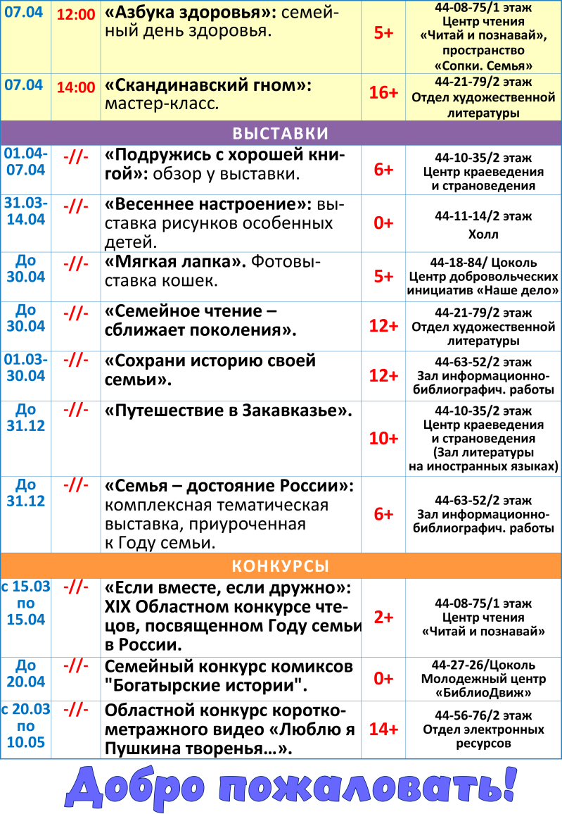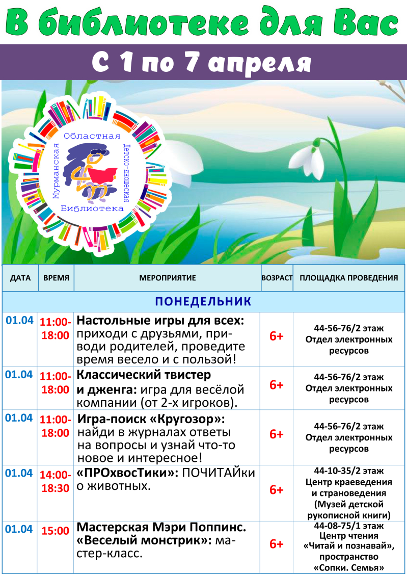Уважаемые посетители, знакомьтесь с программой мероприятий, которые пройдут в библиотеке с 1 по 7 апреля