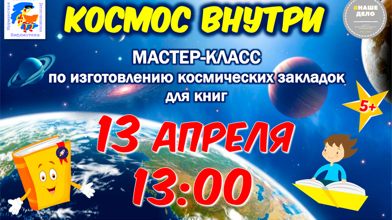 13 апреля в 13:00 приглашаем юных читателей библиотеки и их родителей на творческий мастер-класс по изготовлению «космической» закладки для книг