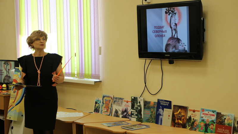 Елена Чугаевская, сотрудник центра чтения «Читай и познавай» прочитала отрывки из книг Александра Ткаченко «Вот ты какой, северный олень!» и Виктора Кокосова «Животные на войне».