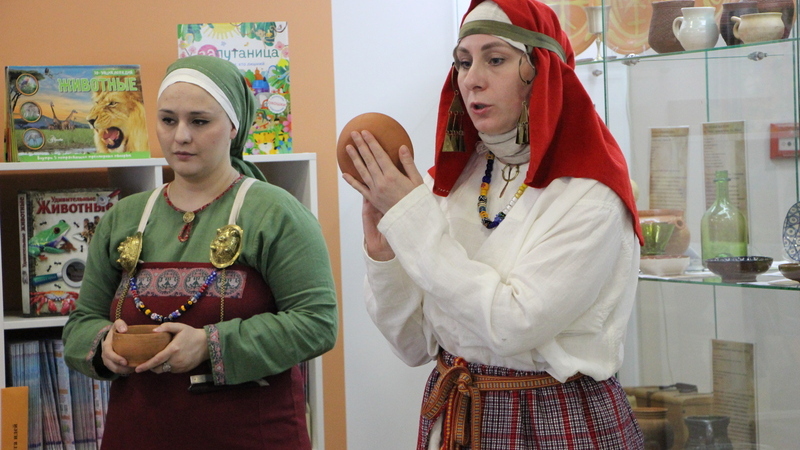 Встреча прошла в интерактивном формате. Ребята не только узнали из чего и как изготавливали посуду, и как за ней ухаживали в Древней Руси и Европе, но подержали в руках некоторые экспонаты. Вера Олеговна и Оксана Леонидовна показали школьникам кухонную утварь из глины, посуду обработанную молоком и глазурью, «миксер» из далеко прошлого и даже ложечку из коровьего рога. С большим интересом школьники рассматривали предметы, изучали их на ощупь, охотно расспрашивали об экземплярах. А после с удовольствием фотографировались у выставки.