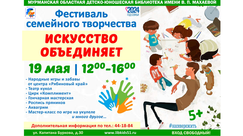 19 мая с 12:00 до 16:00 в Областной детско-юношеской библиотеке имени В. П. Махаевой состоится фестиваль семейного творчества «Искусство объединяет»