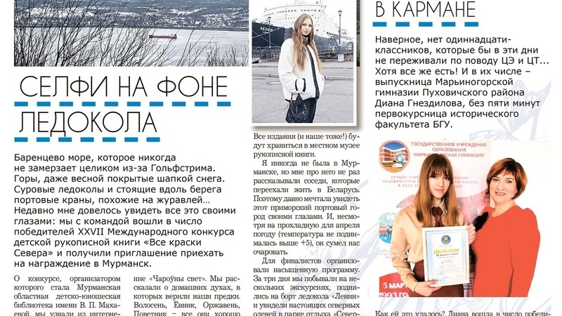 В материале Василина рассказывает о конкурсе, о поездке на север, знакомит читателей с книгой, которую она написала в соавторстве с друзьями. Рукописное издание «Чароўны свет», рассказывающее о домашних духах, заняло первое место в номинации «Познаем народы, страны – познаем себя».