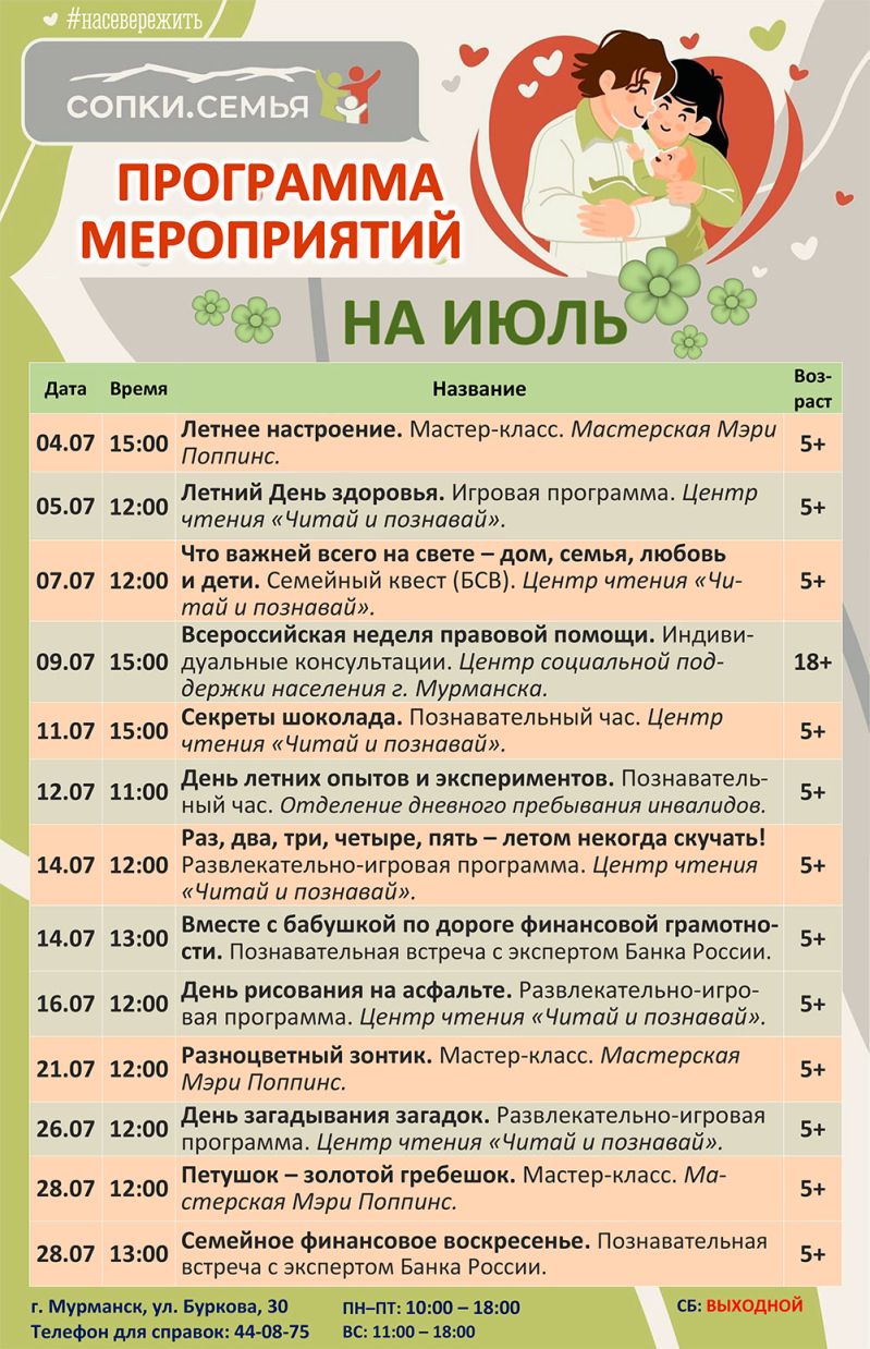 Присоединяйтесь к познавательным активностям в СОПКАХ.СЕМЬЯ – ребят и их родителей ждут развлекательно-игровые программы, увлекательный семейный квест, а также индивидуальные консультации в рамках «Социального лектория». Раскрыть и проявить творческие способности юным мурманчанам поможет творческая мастерская Мэри Поппинс.