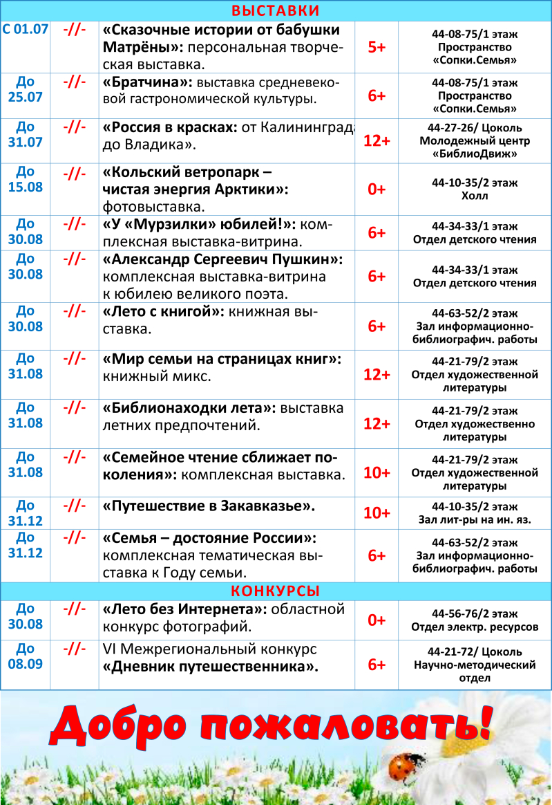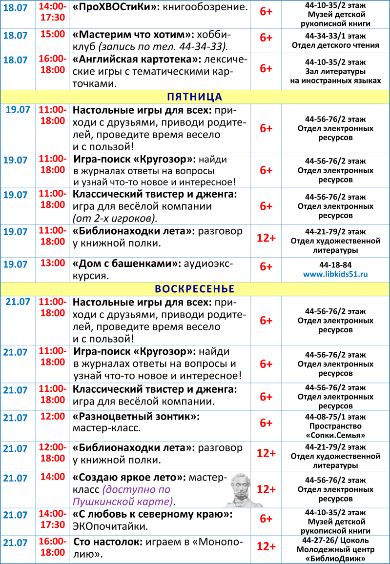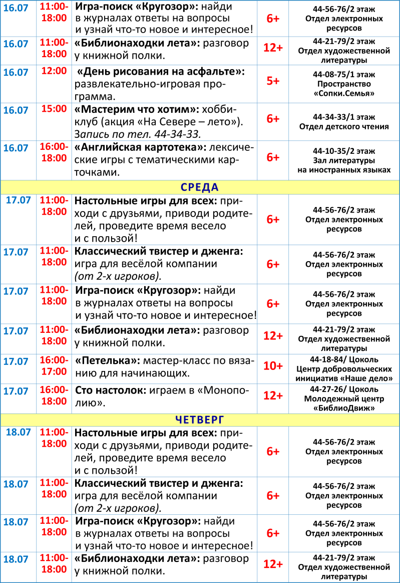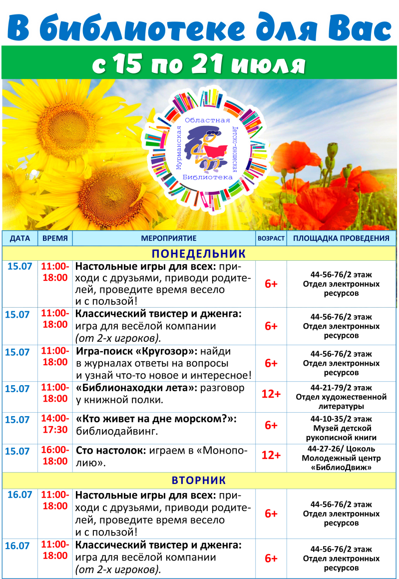 Уважаемые посетители, знакомьтесь с программой мероприятий, которые пройдут в библиотеке с 15 по 21 июля