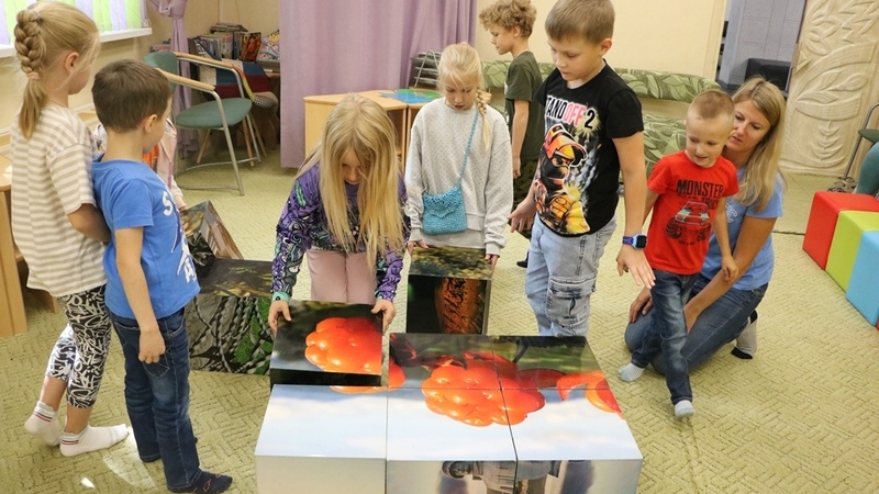 Затем участники искали лето в лесу: отгадывали лесные загадки, складывали пазлы с насекомыми, цветами, ягодами, выступали в роли эхо, выполняли задания по книге «Времена года». Ребята собрали шикарные букеты из цветов в эстафете «Летний букет» и дружно сложили из кубиков-гигантов северную ягоду – морошку!