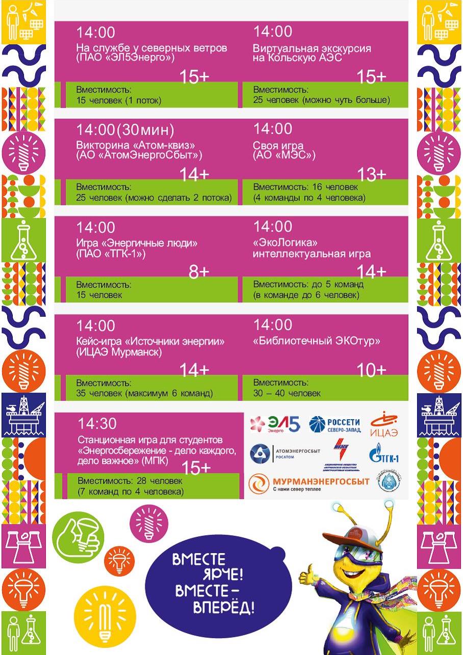 Партнеры и соорганизаторы фестиваля: ГОКУ «Агентство энергетической эффективности Мурманской области», ГАНОУ МО «ЦО «Лапландия», ГОУП «Мурманскводоканал», АО «АтомЭнергоСбыт», ПАО «ТГК-1», АО «МОЭСК», АО «МЭС», ПАО ЭЛ5-Энерго, ИЦАЭ г. Мурманск, Россети Северо-Запад, Кольская АЭС.