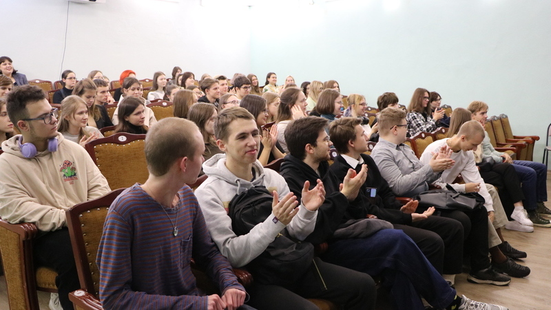 Так, Виолетта поделилась трогательными моментами из своей переводческой практики, а ещё оптимистично, но жёстко заверила студентов, что в этой профессии никогда нельзя опускать руки и главное – «не замолчать», а переводчик – «существо, которое может приспособиться ко всему». Были и вопросы практического характера: куда устроиться на работу без опыта, какие языки сейчас наиболее востребованы, как вести себя в нестандартных рабочих ситуациях. Виолетта создала удивительно тёплую атмосферу в зале, поэтому студенты чувствовали себя с ней свободно и откровенно говорили о том, что их волнует, а затем внимательно слушали и перенимали профессиональный опыт.