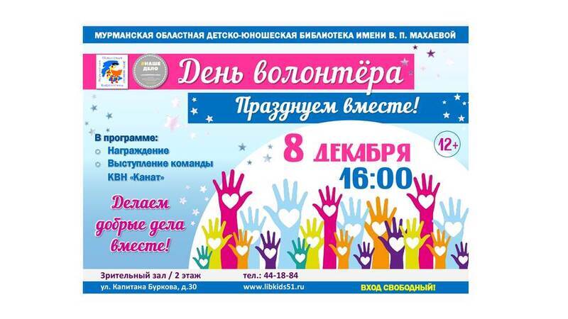 8 декабря в 16:00 в Мурманской областной детско-юношеской библиотеке имени В.П. Махаевой состоится вечер, посвященный празднованию Международного дня волонтера (добровольца)