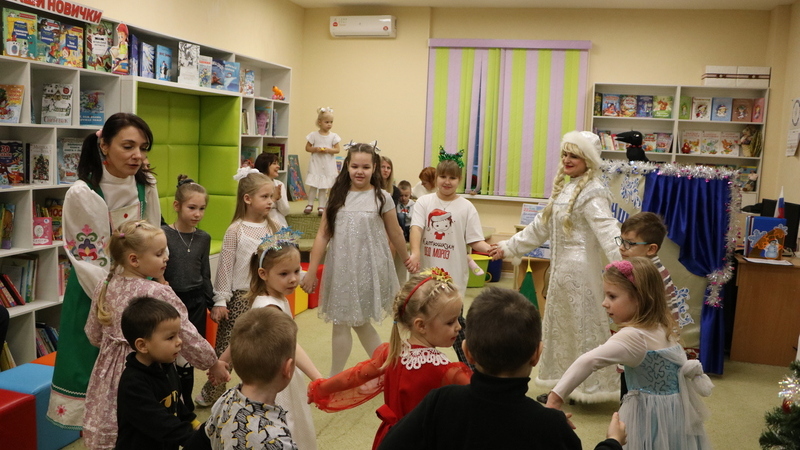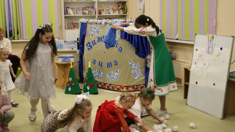 Дети стали непосредственными участниками театрализованного представления. Юные читатели вместе с Машенькой не только играли, но и развлекались и танцевали. Они разгадывали загадки, участвовали в новогодних состязаниях: украшали ёлочки на скорость, рисовали снеговика, «загребали» снежки руками. Каждый момент был наполнен радостью и смехом.