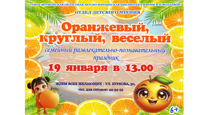 Отдел детского чтения приглашает всех желающих отправиться в увлекательное путешествие в мир волшебства и создать апельсиновое настроение. Вы узнаете много нового о вкусном экзотическом фрукте, об истории необычного праздника, познакомитесь с «апельсиновыми» сказками». А еще вас ждут игры, конкурсы, эстафеты и мастер-класс.